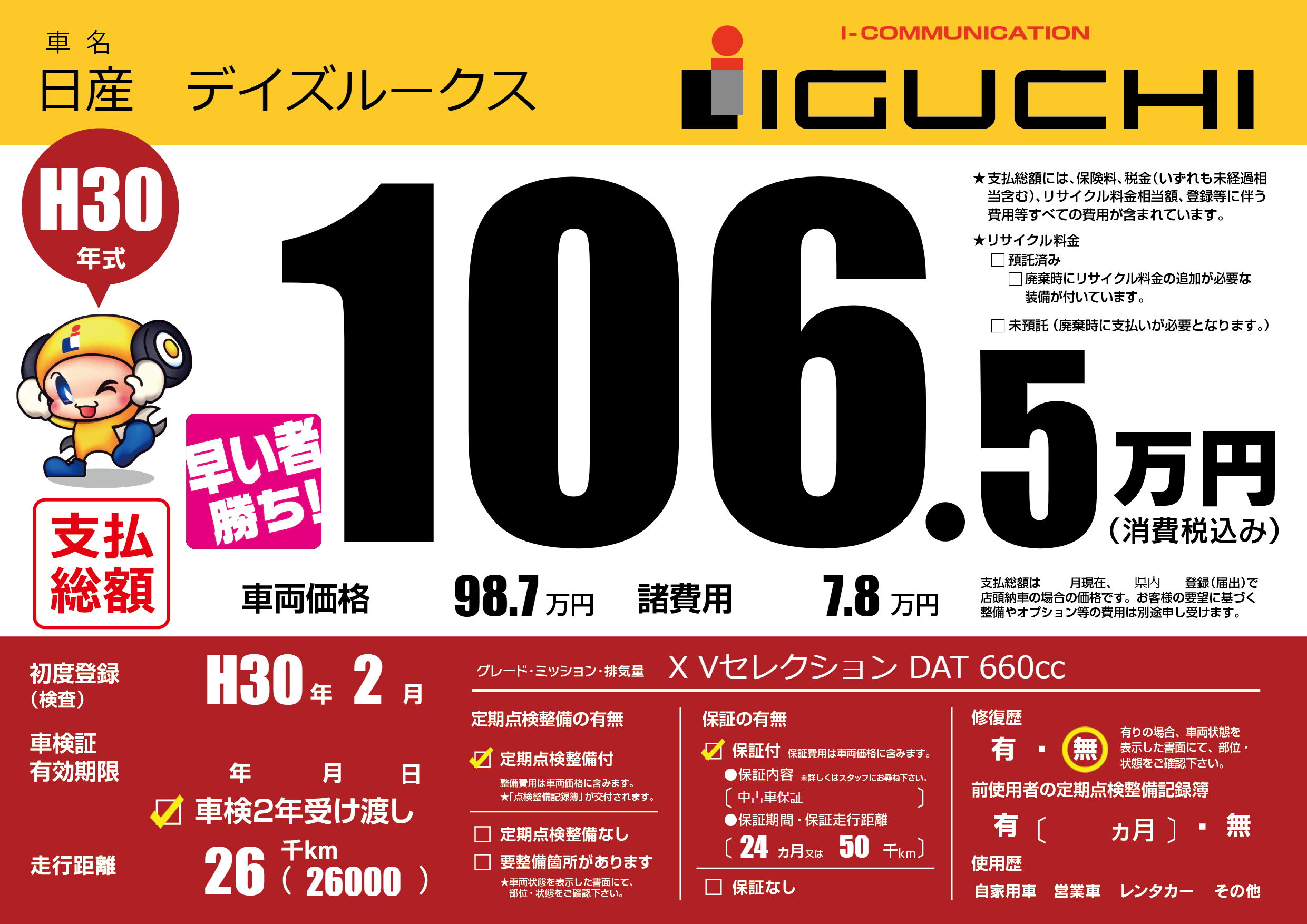 | 車名 | 日産 デイズルークス | グレード ミッション 排気量 |