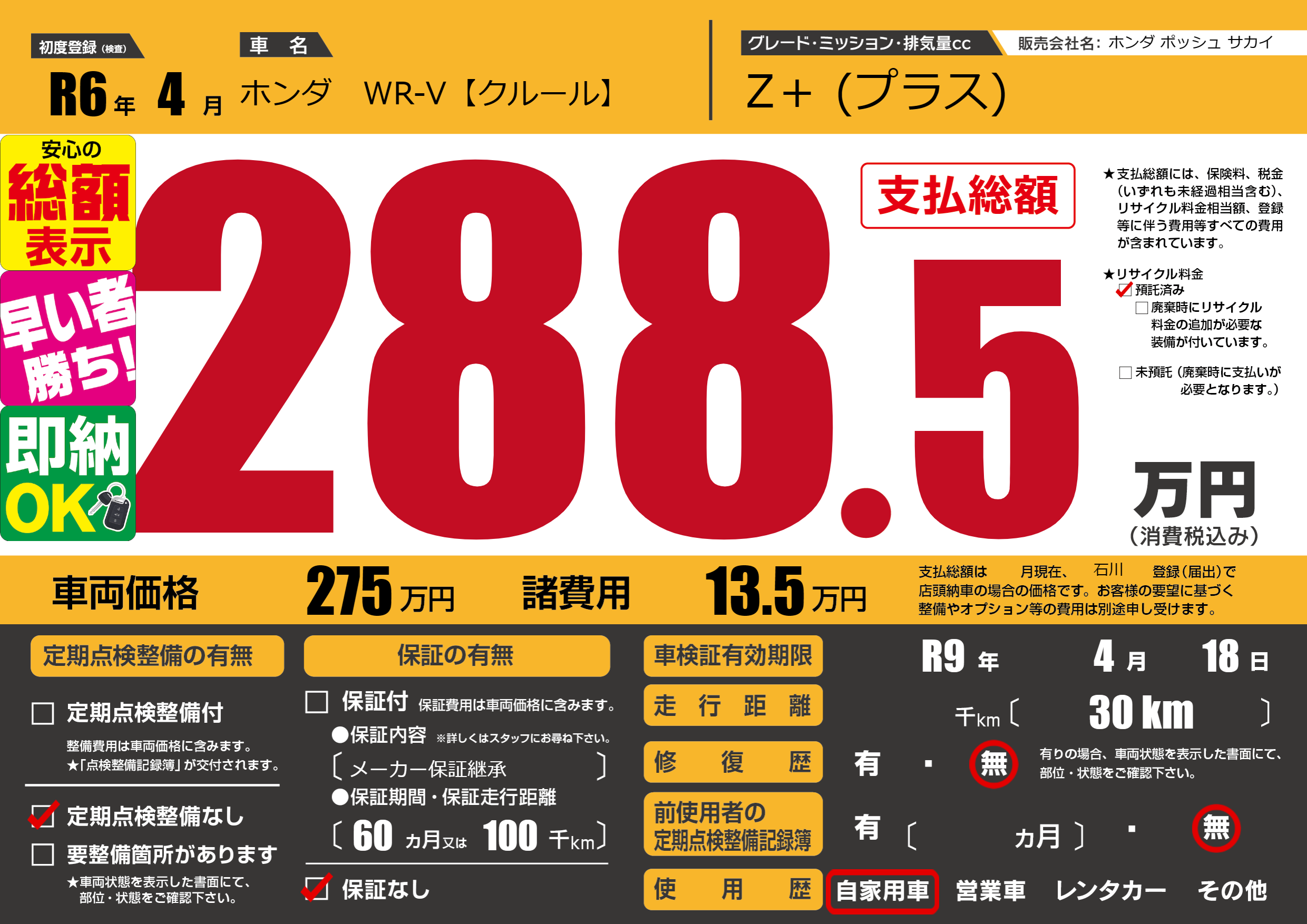 | 車名 | ホンダ WR-V【クルール】 | グレード ミッション 排気量 |