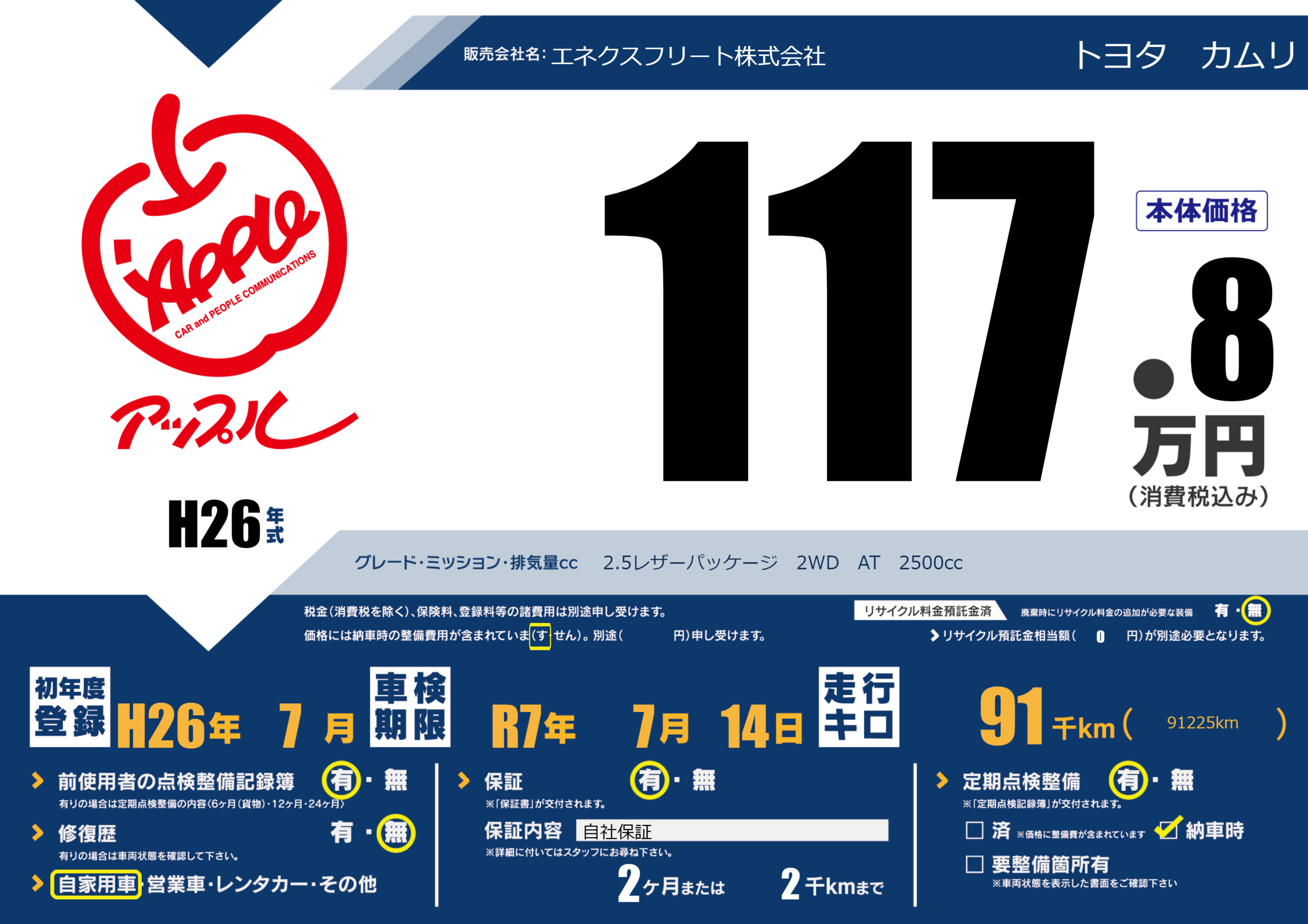 | 走行キロ | 9.1万km | 初年度登録 | H26年7月 |