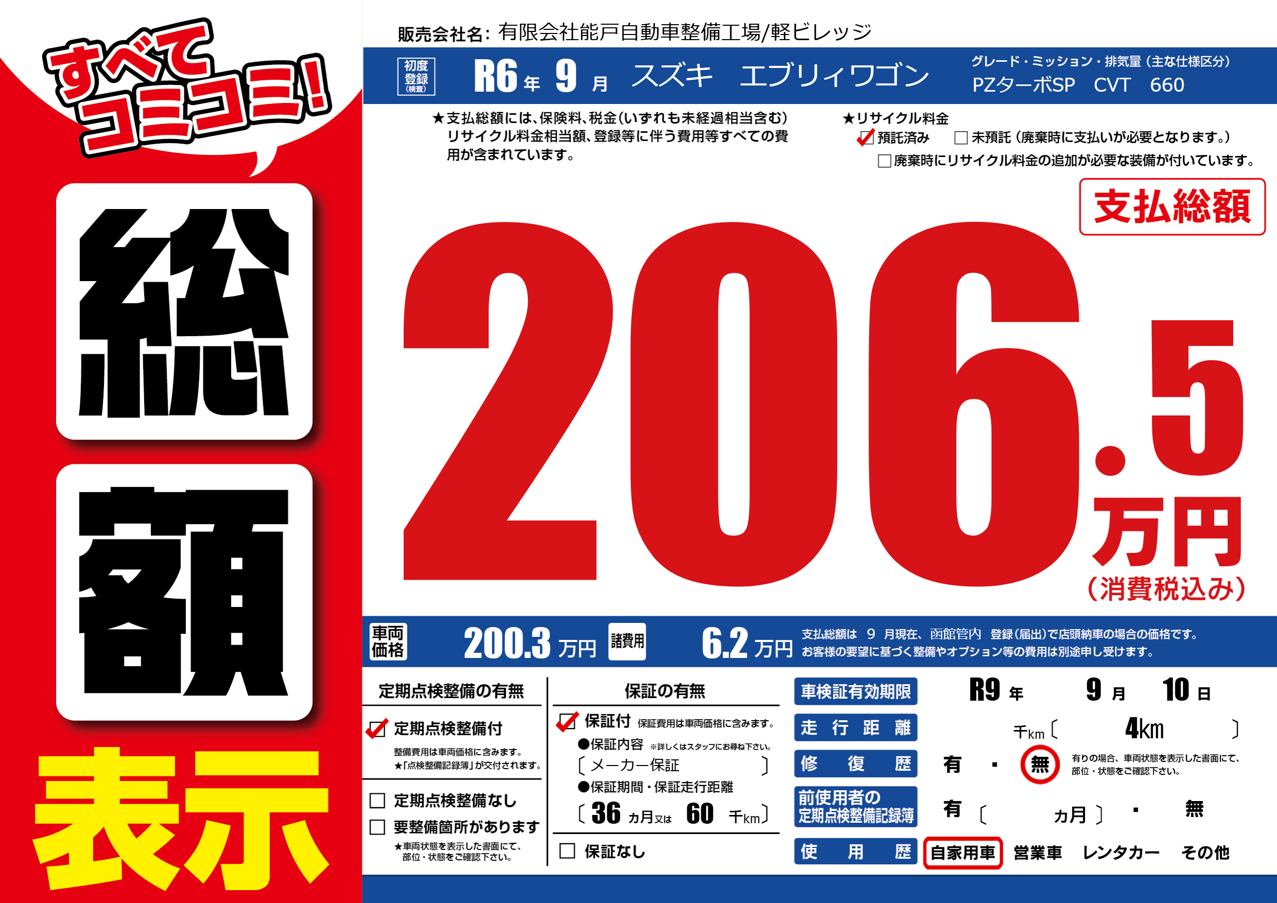 | 車名 | スズキ エブリィワゴン | グレード ミッション 排気量 |