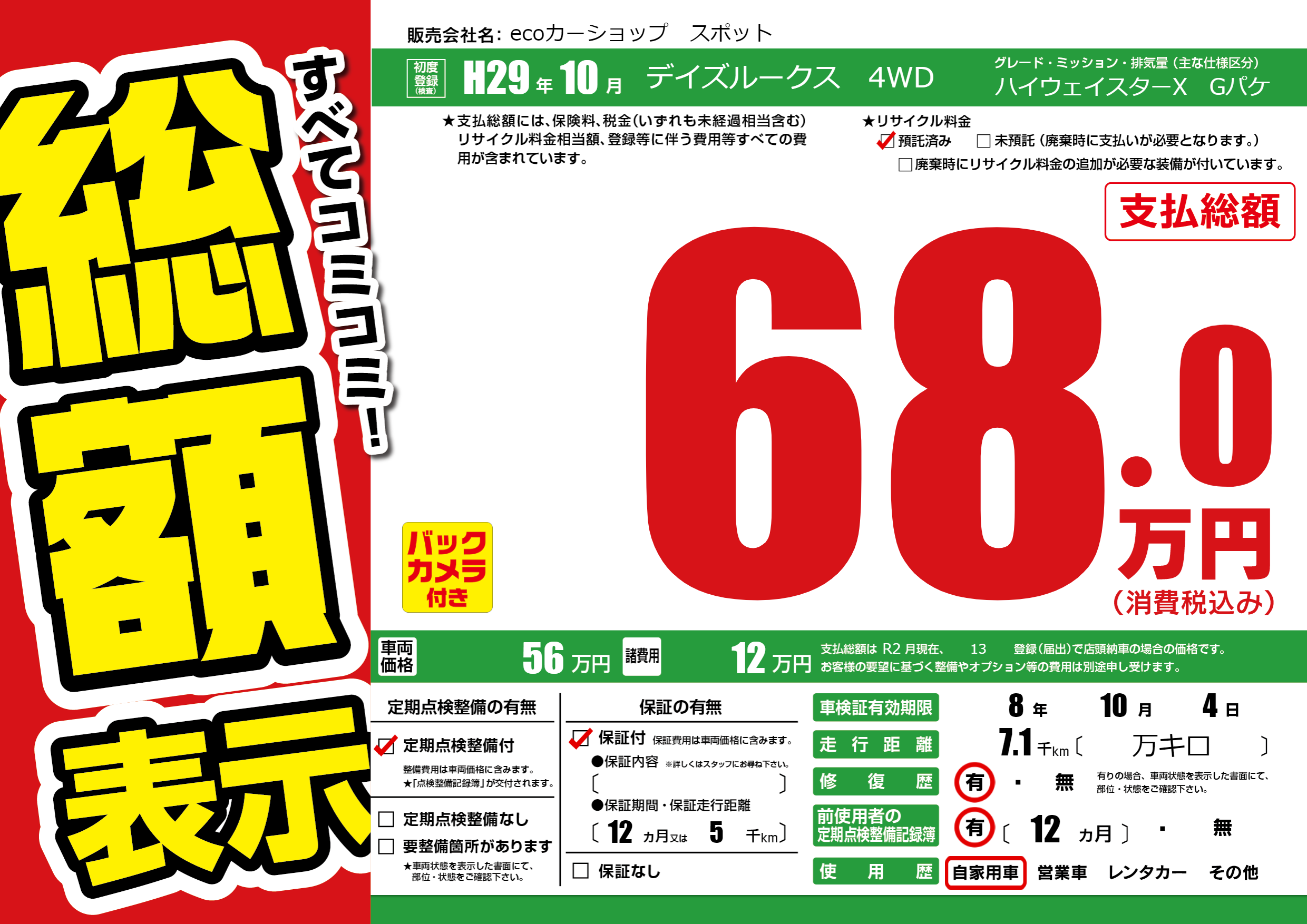 | 走行キロ | 0.7万km | 初年度登録 | H29年10月 |