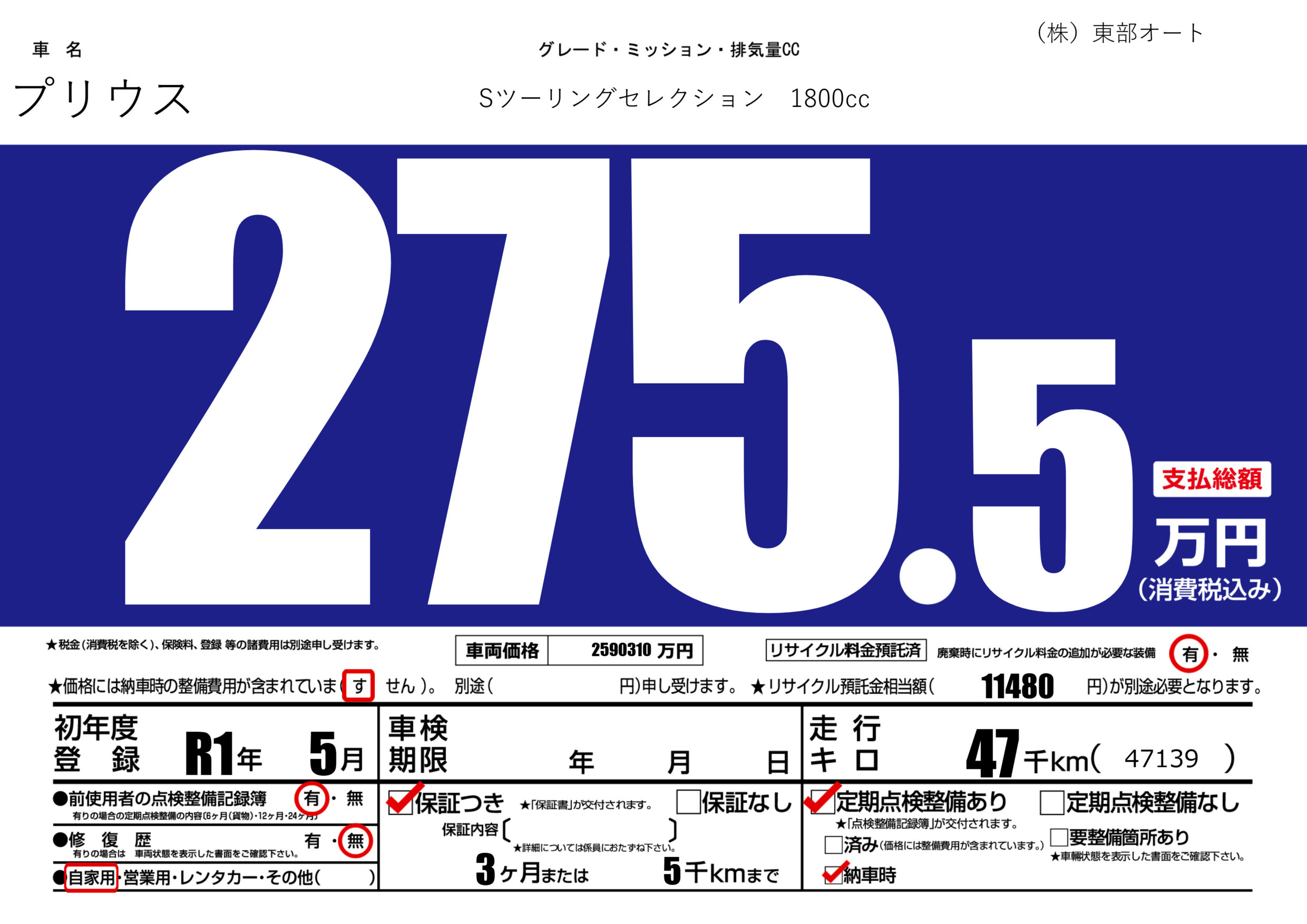 保証付き 保証内容(---) 3ヶ月または(5)千kmまで |