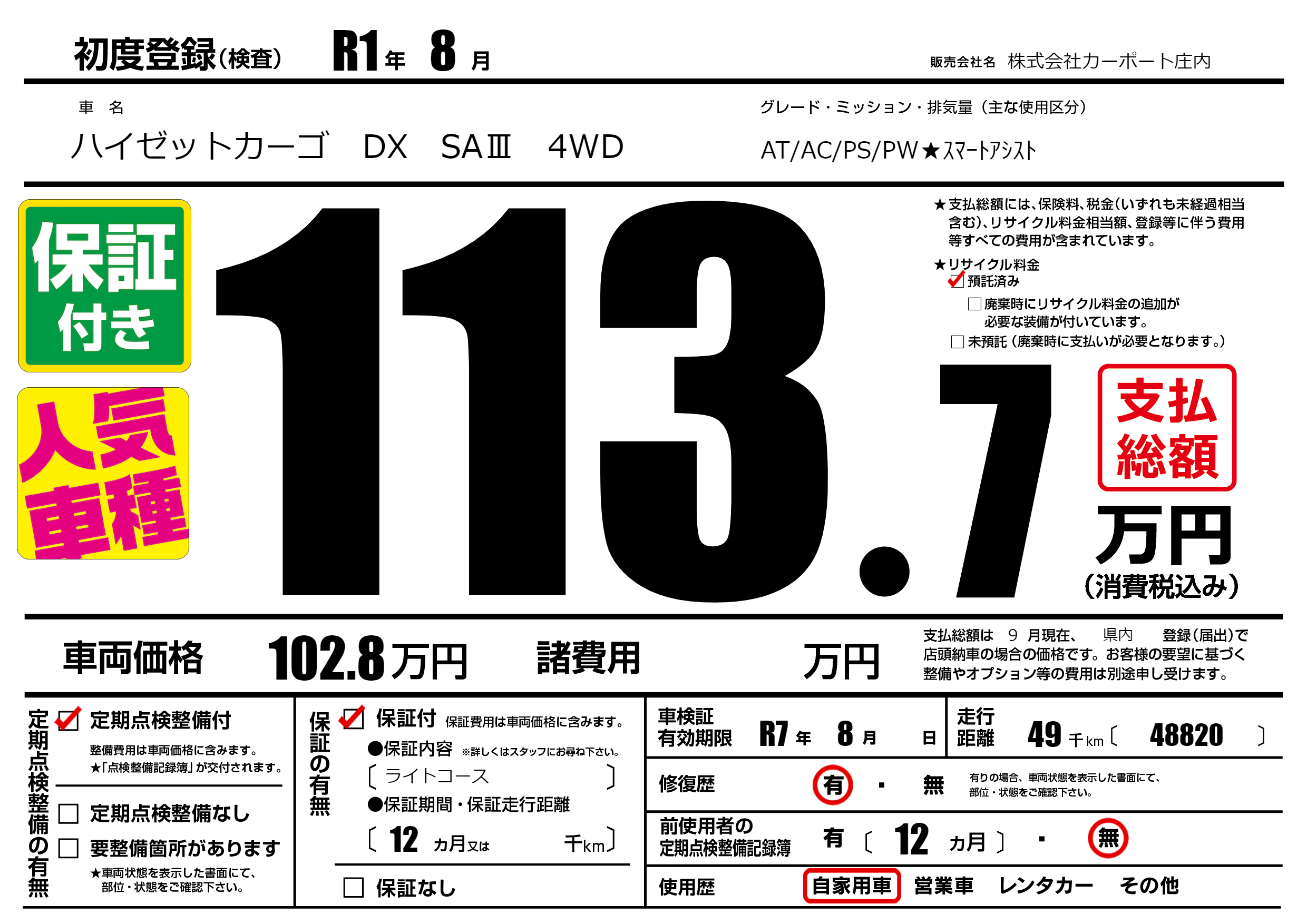 | 車名 | ハイゼットカーゴ DX SAⅢ 4WD | グレード ミッション 排気量 |