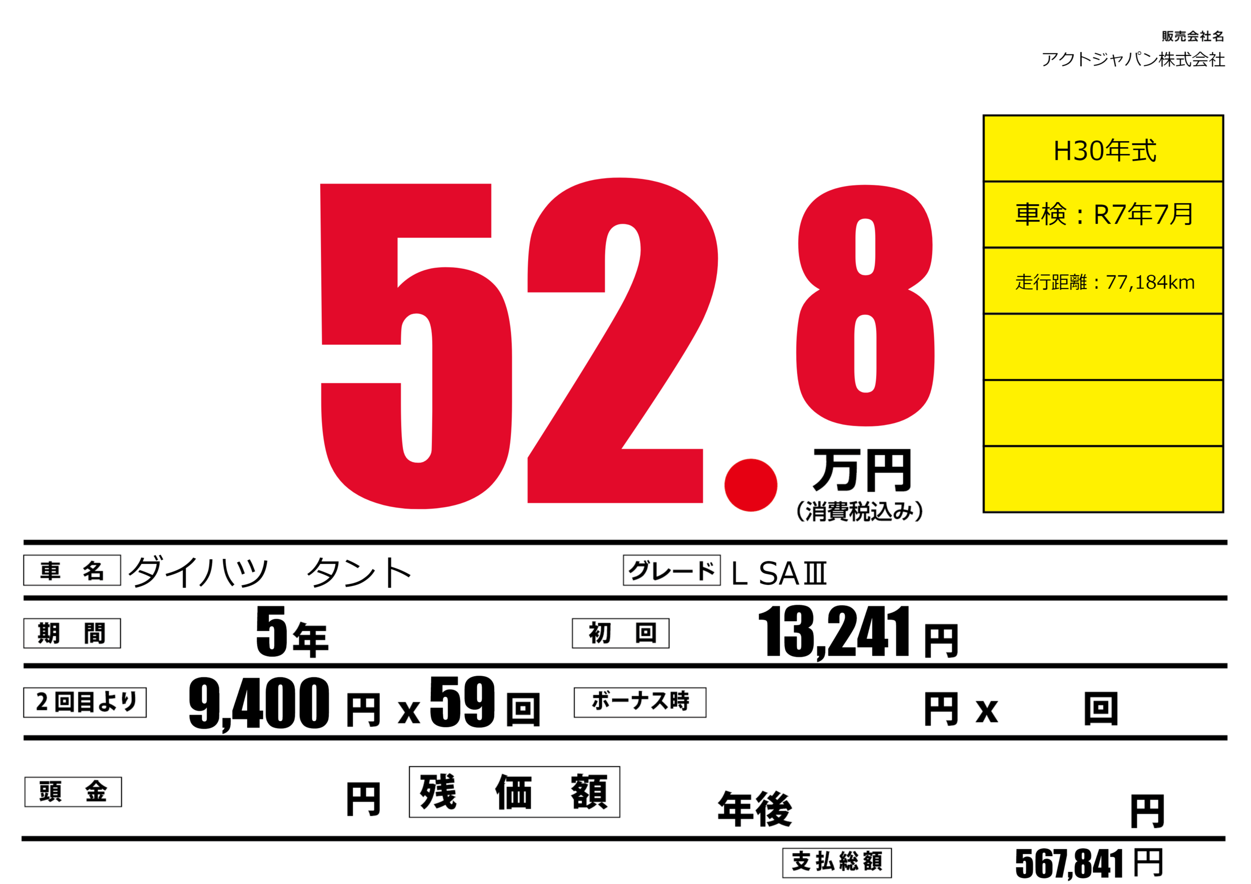 | 車名 | ダイハツ タント | グレード ミッション 排気量 |