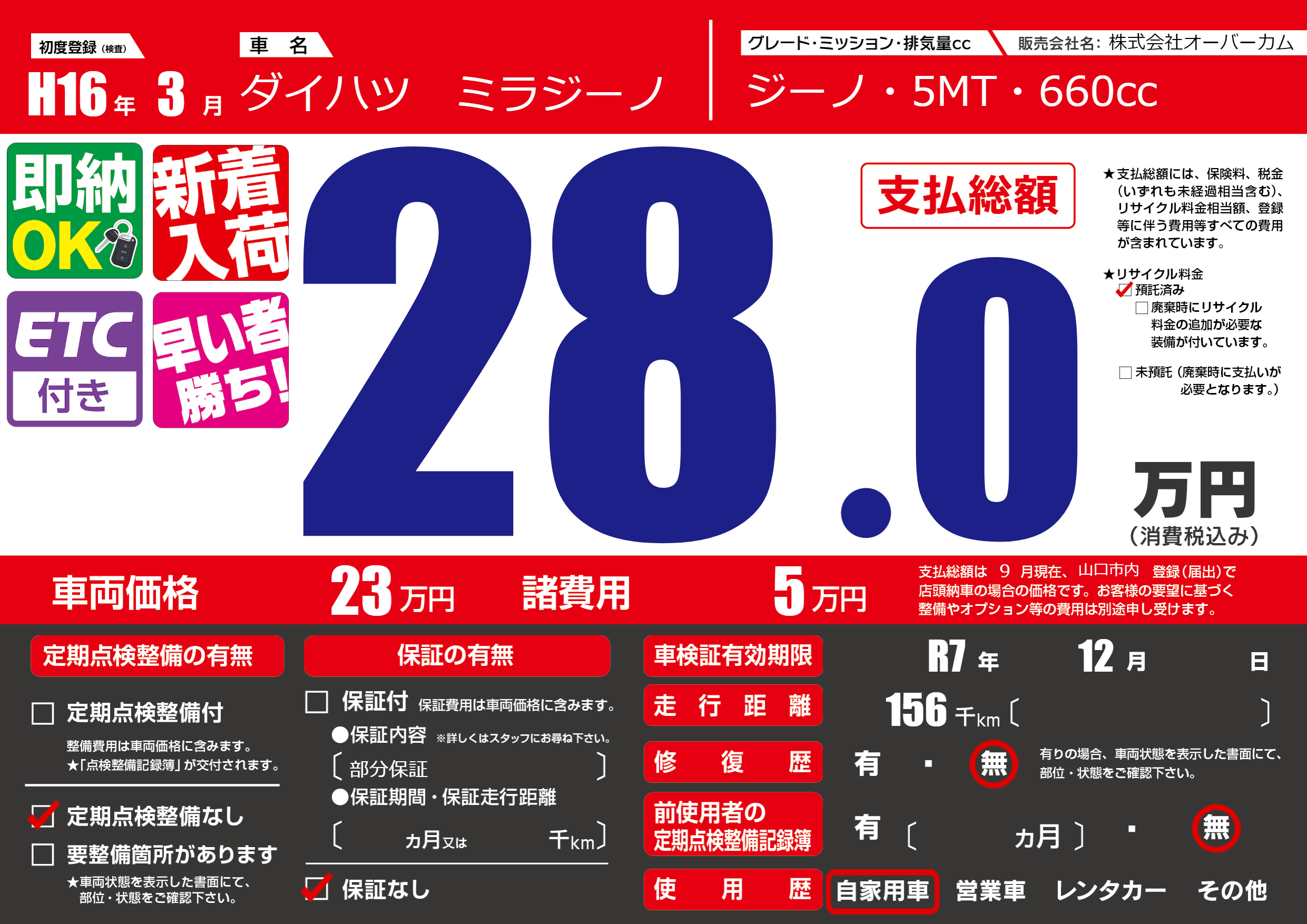 | 走行キロ | 15.6万km | 初年度登録 | H16年3月 |