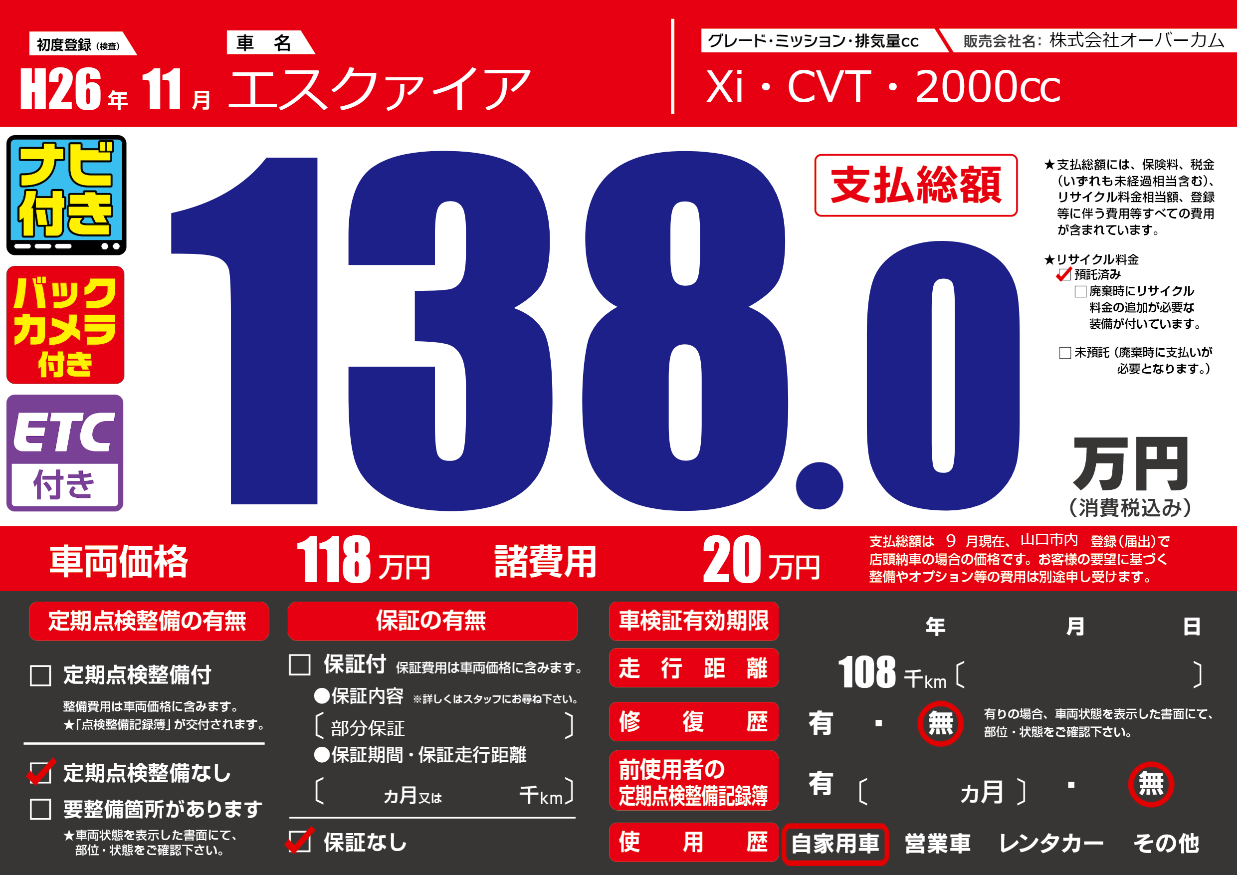 | 走行キロ | 10.8万km | 初年度登録 | H26年11月 |