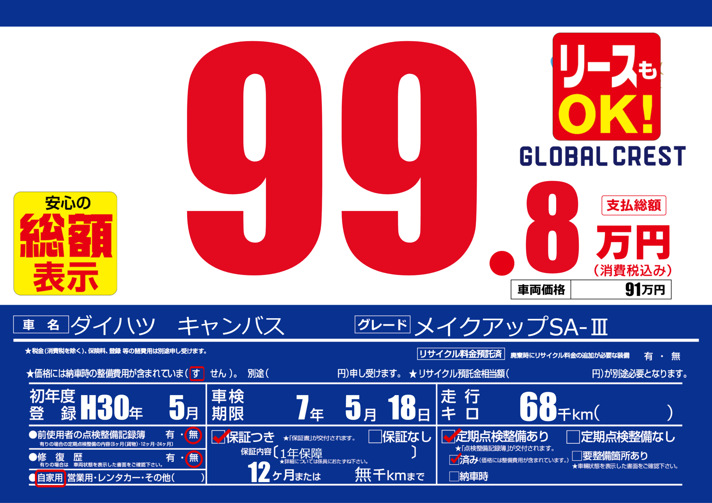 | 定期点検整備 | 定期点検整備あり 定期点検整備済み | ||