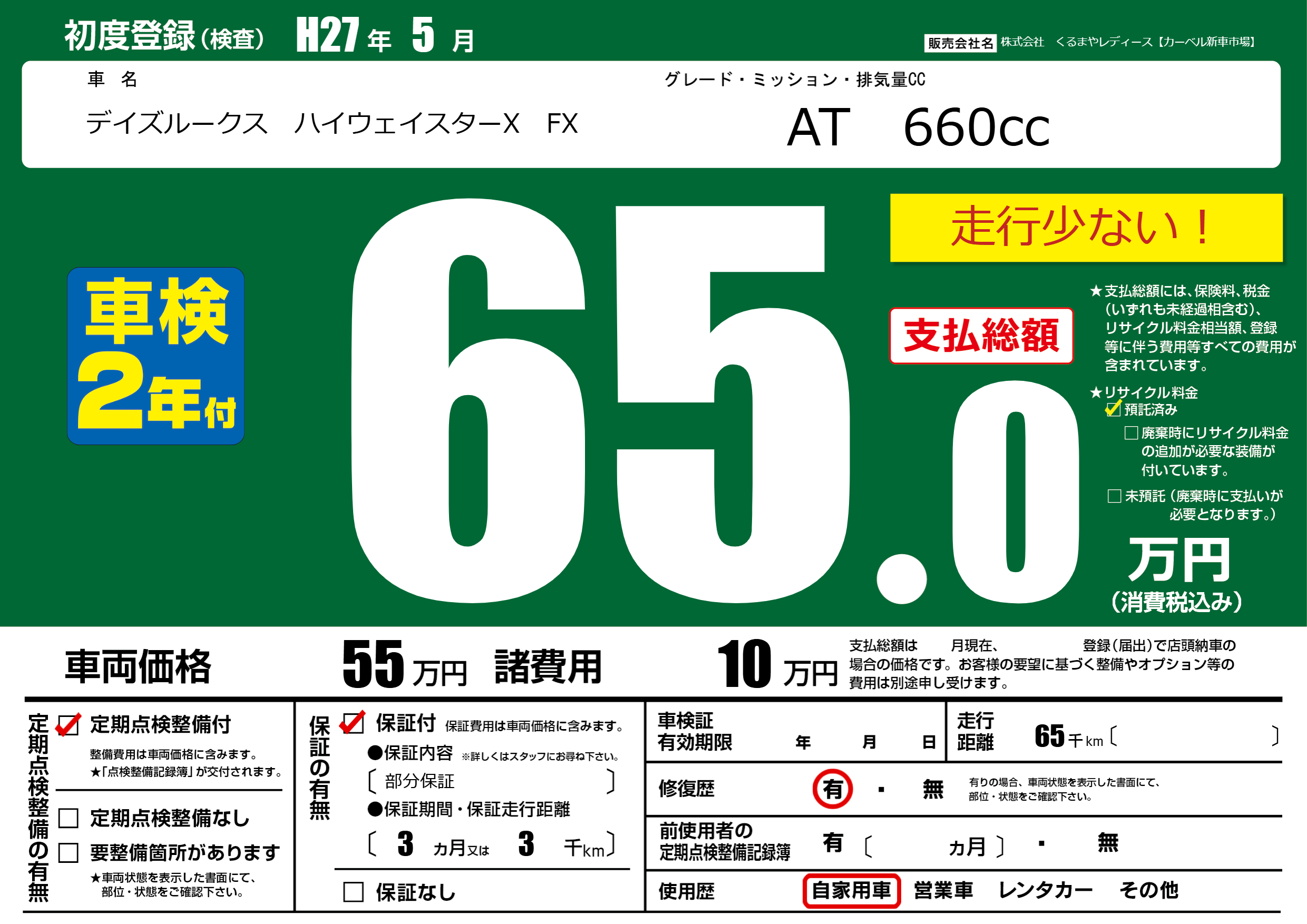 | 走行キロ | 6.5万km | 初年度登録 | H27年5月 |