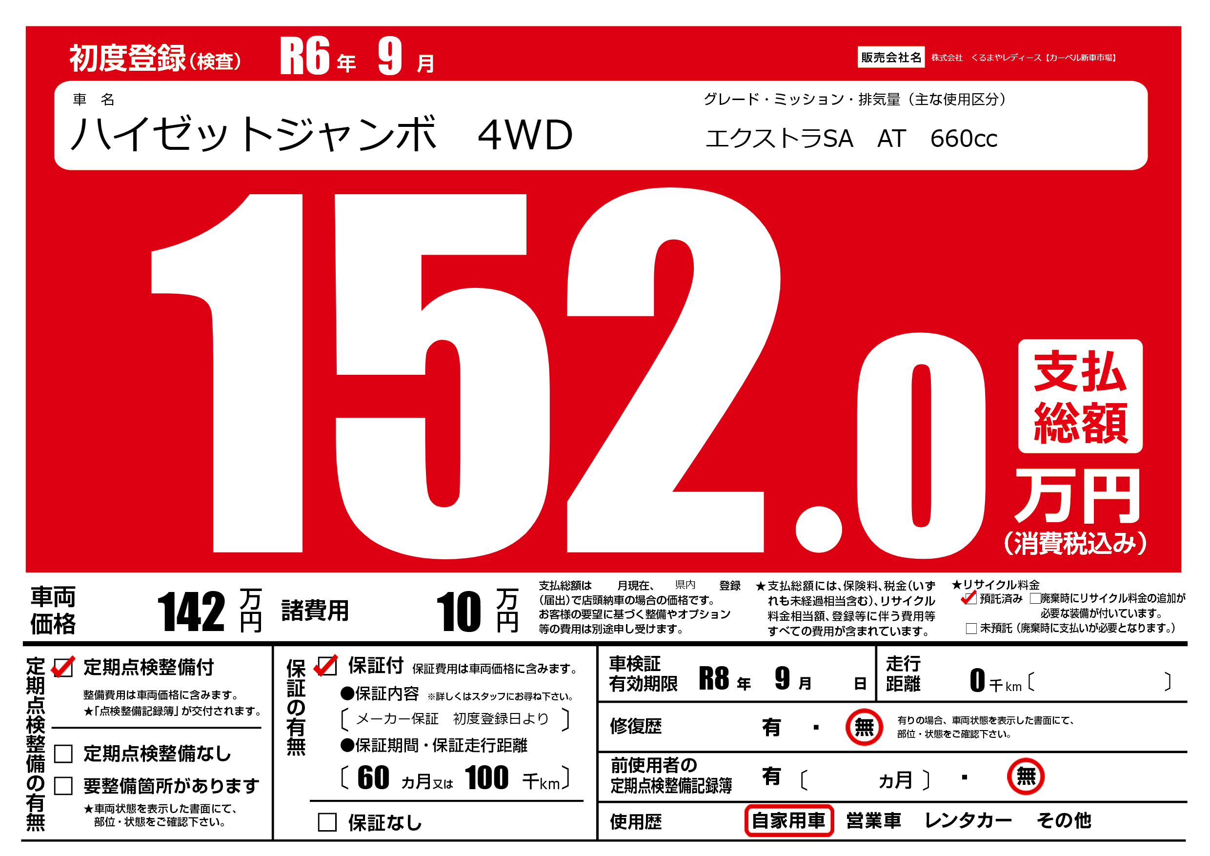 | 走行キロ | - | 初年度登録 | R6年9月 |
