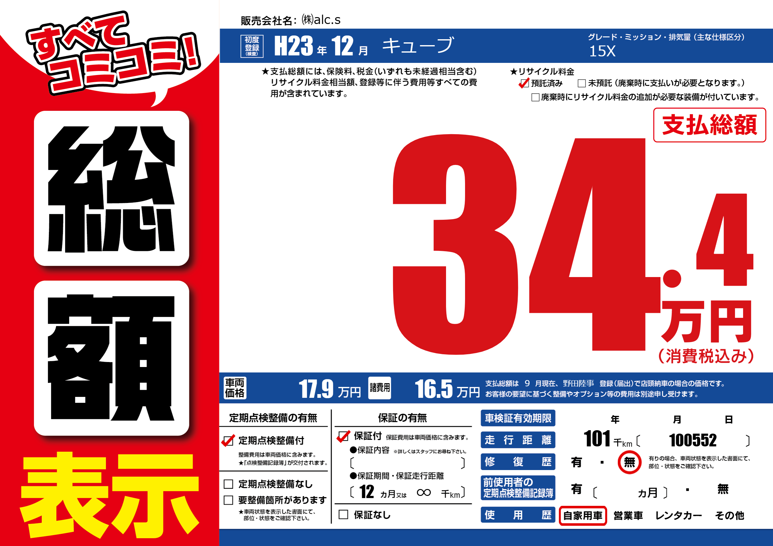 | 走行キロ | 10.1万km | 初年度登録 | H23年12月 |