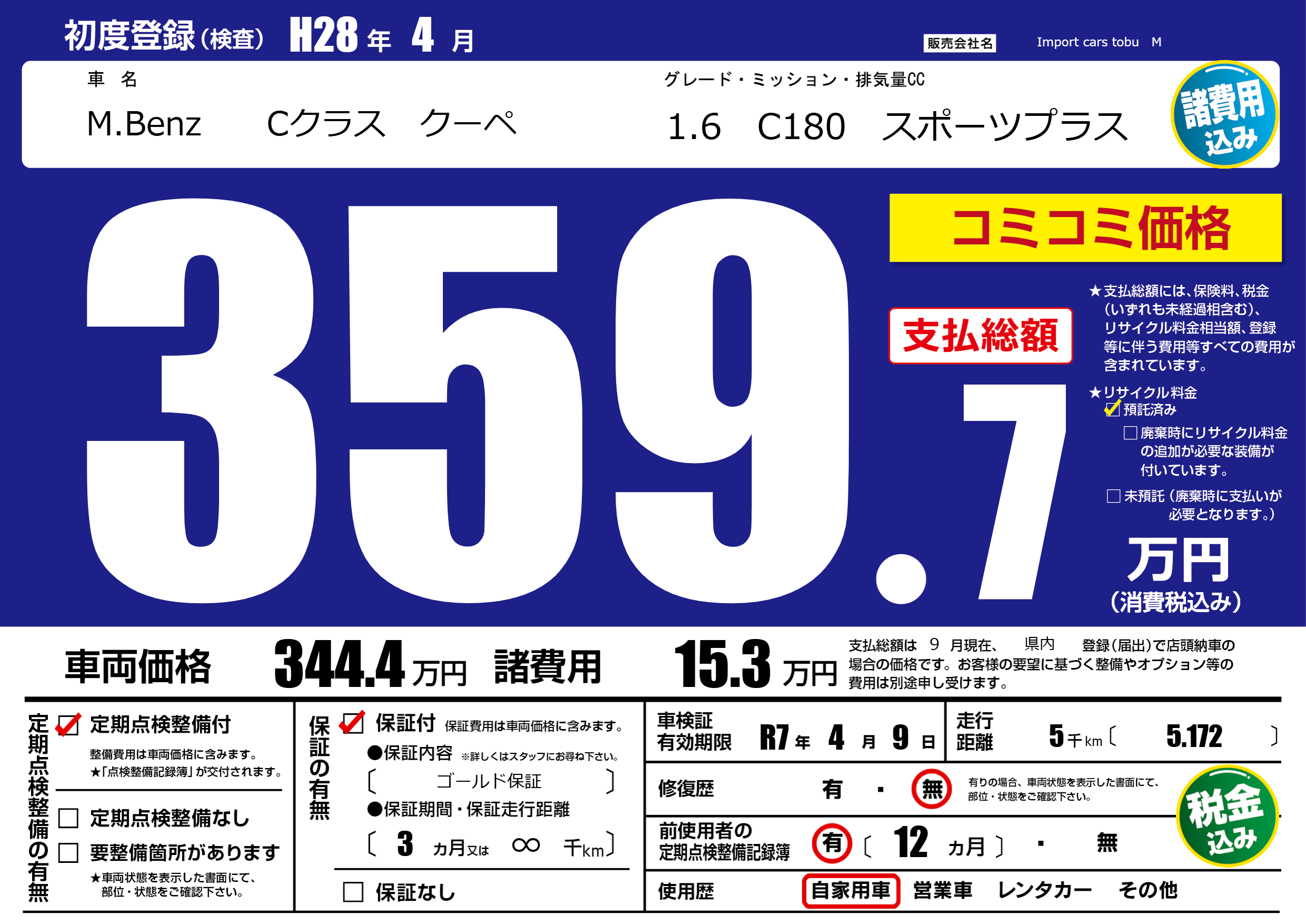 | 車名 | M.Benz Cクラス クーペ | グレード ミッション 排気量 |
