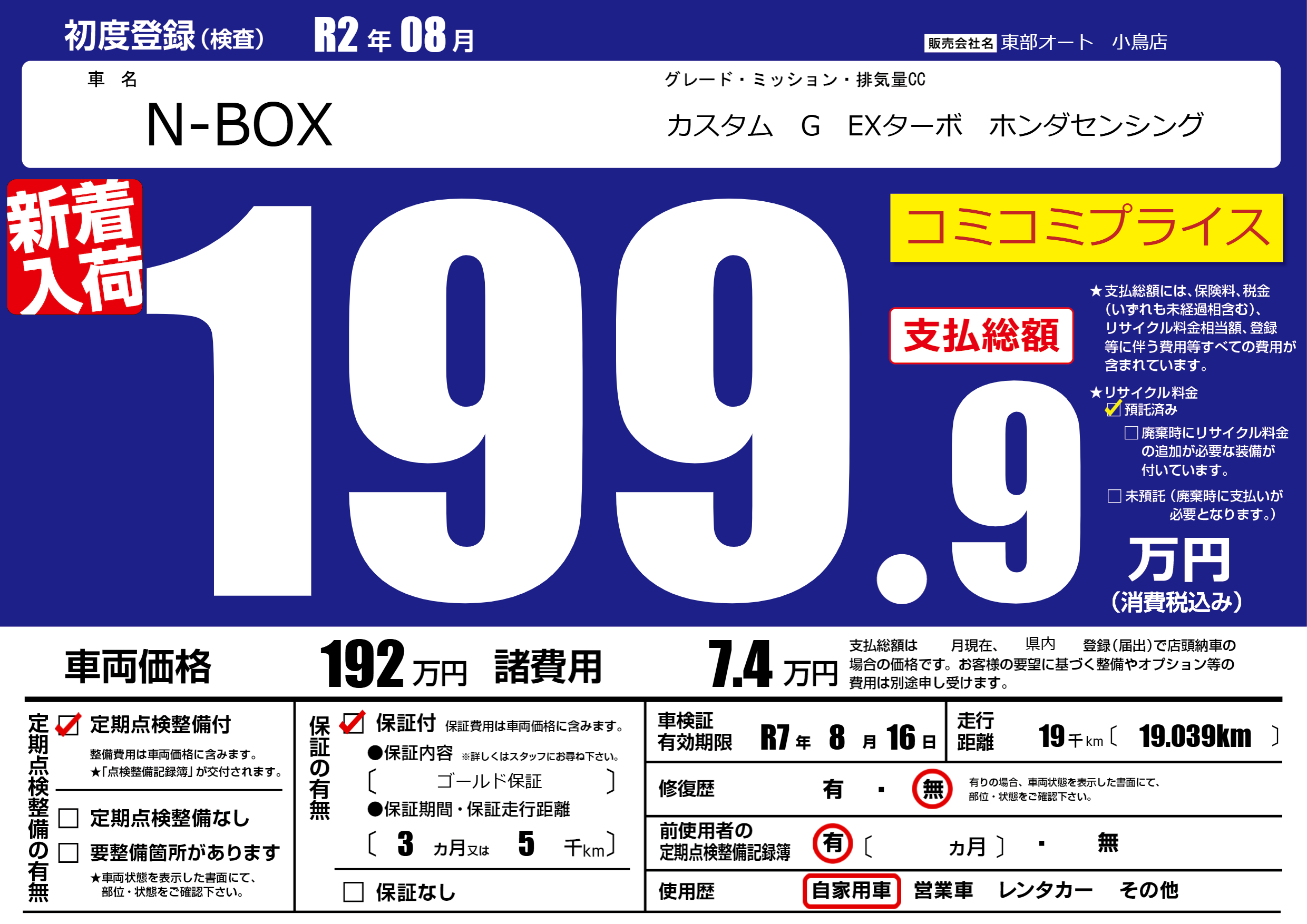 | 車名 | N-BOX | グレード ミッション 排気量 |
