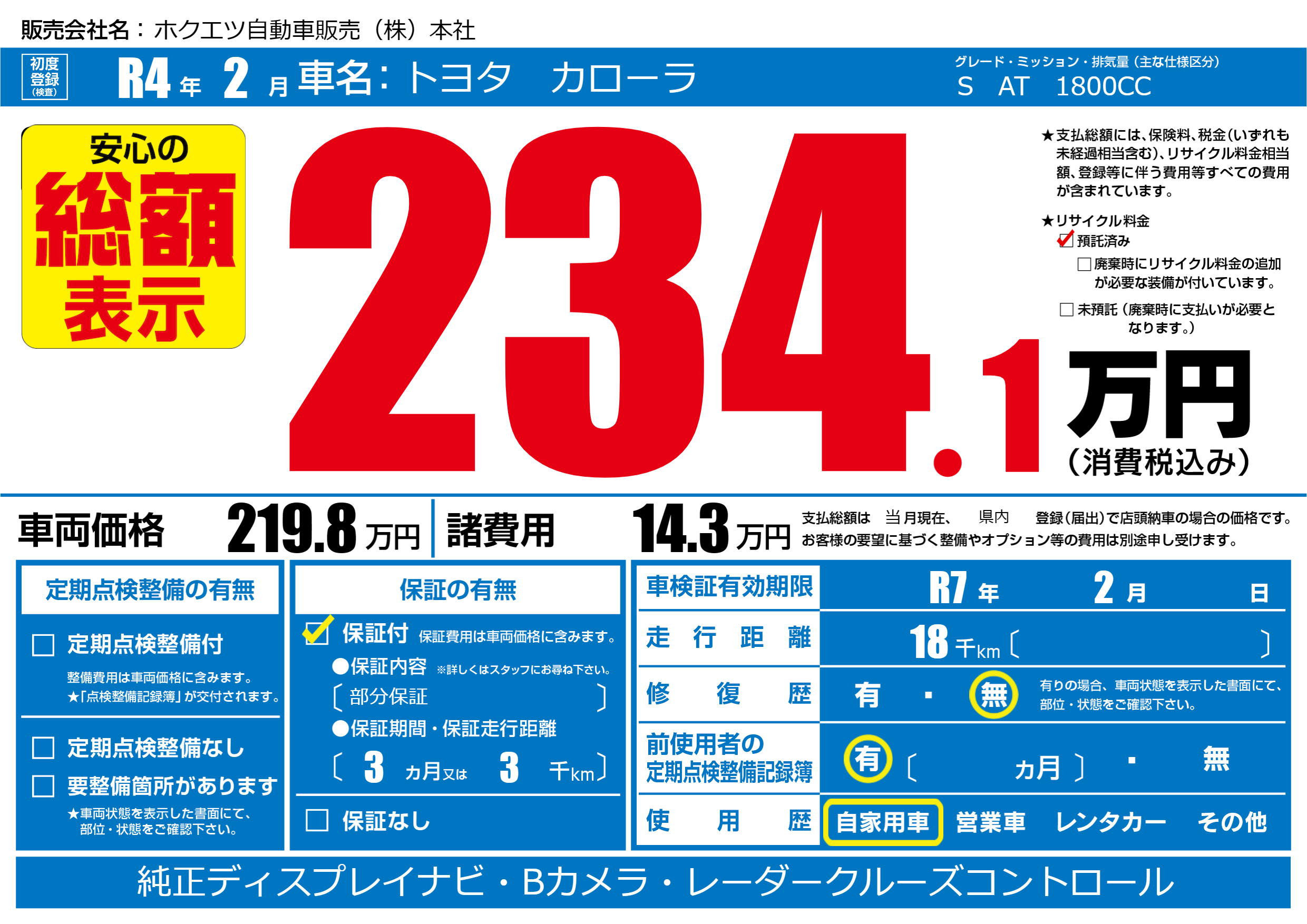 | 走行キロ | 1.8万km | 初年度登録 | R4年2月 |