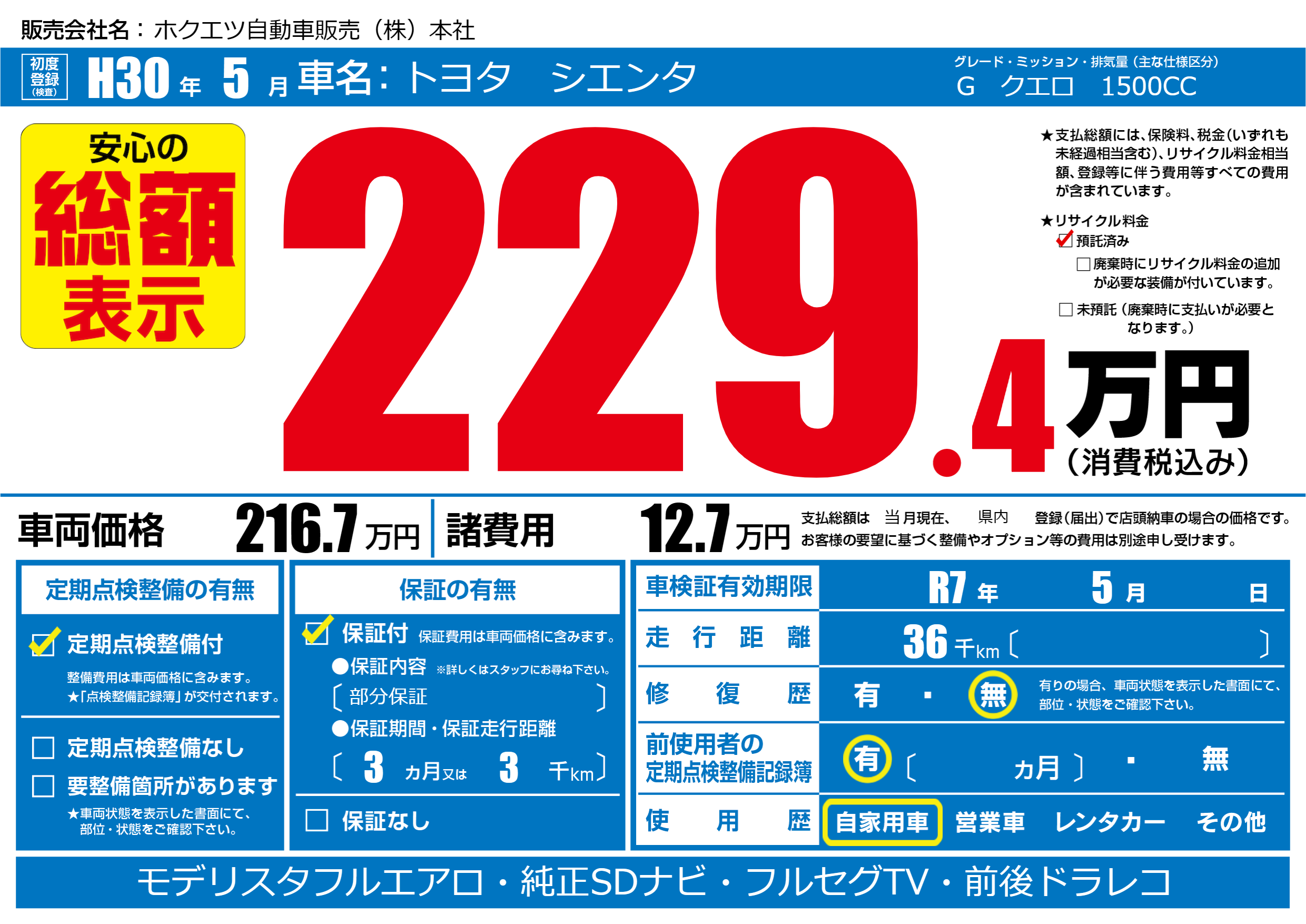 | 車名 | トヨタ シエンタ | グレード ミッション 排気量 |
