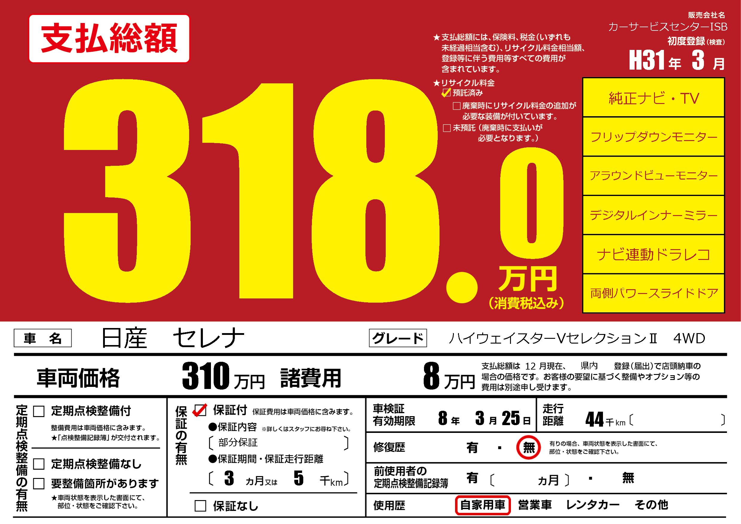 | 車名 | 日産 セレナ | グレード ミッション 排気量 |