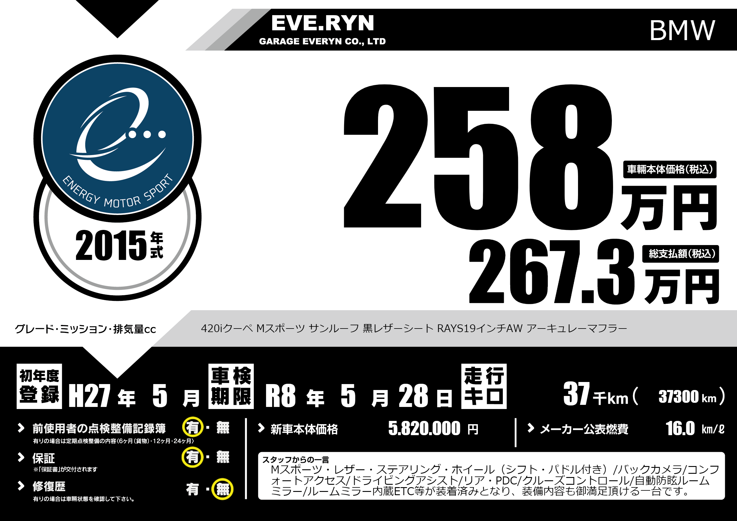420iクーペ Mスポーツ サンルーフ 黒レザーシート RAYS19インチAW アーキュレーマフラー |