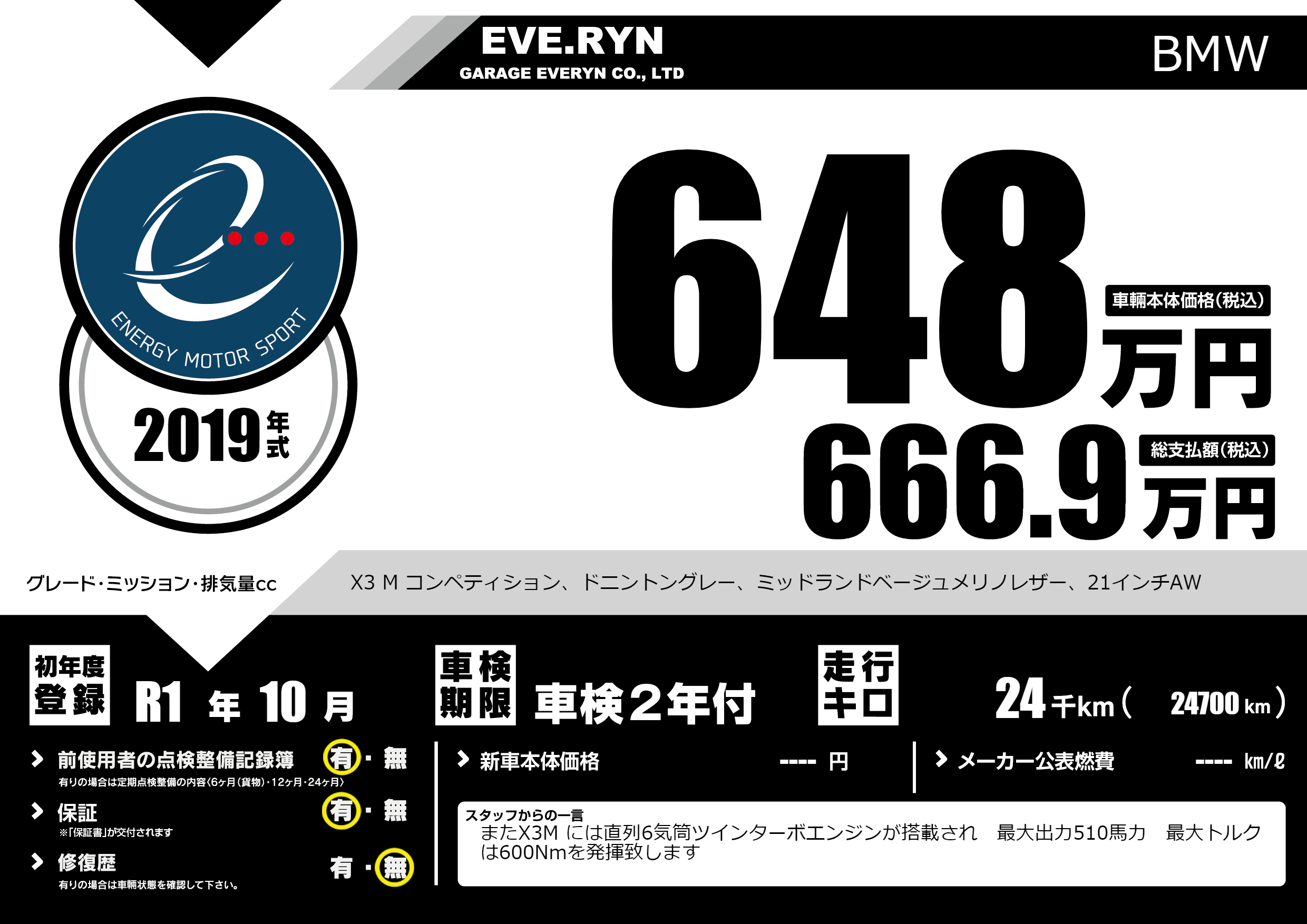 | 走行キロ | 2.4万km | 初年度登録 | R1年10月 |