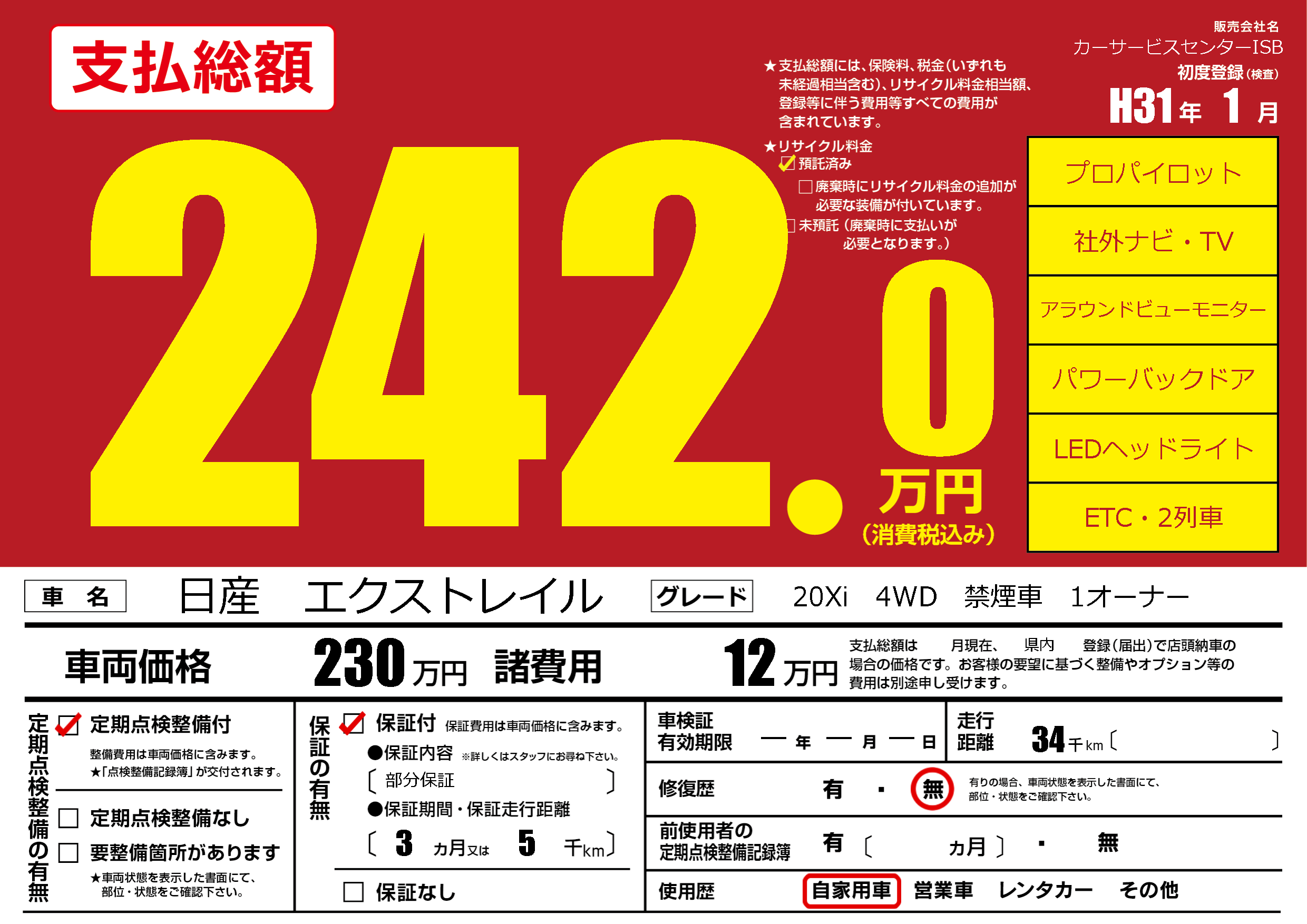 | 走行キロ | 3.4万km | 初年度登録 | H31年1月 |