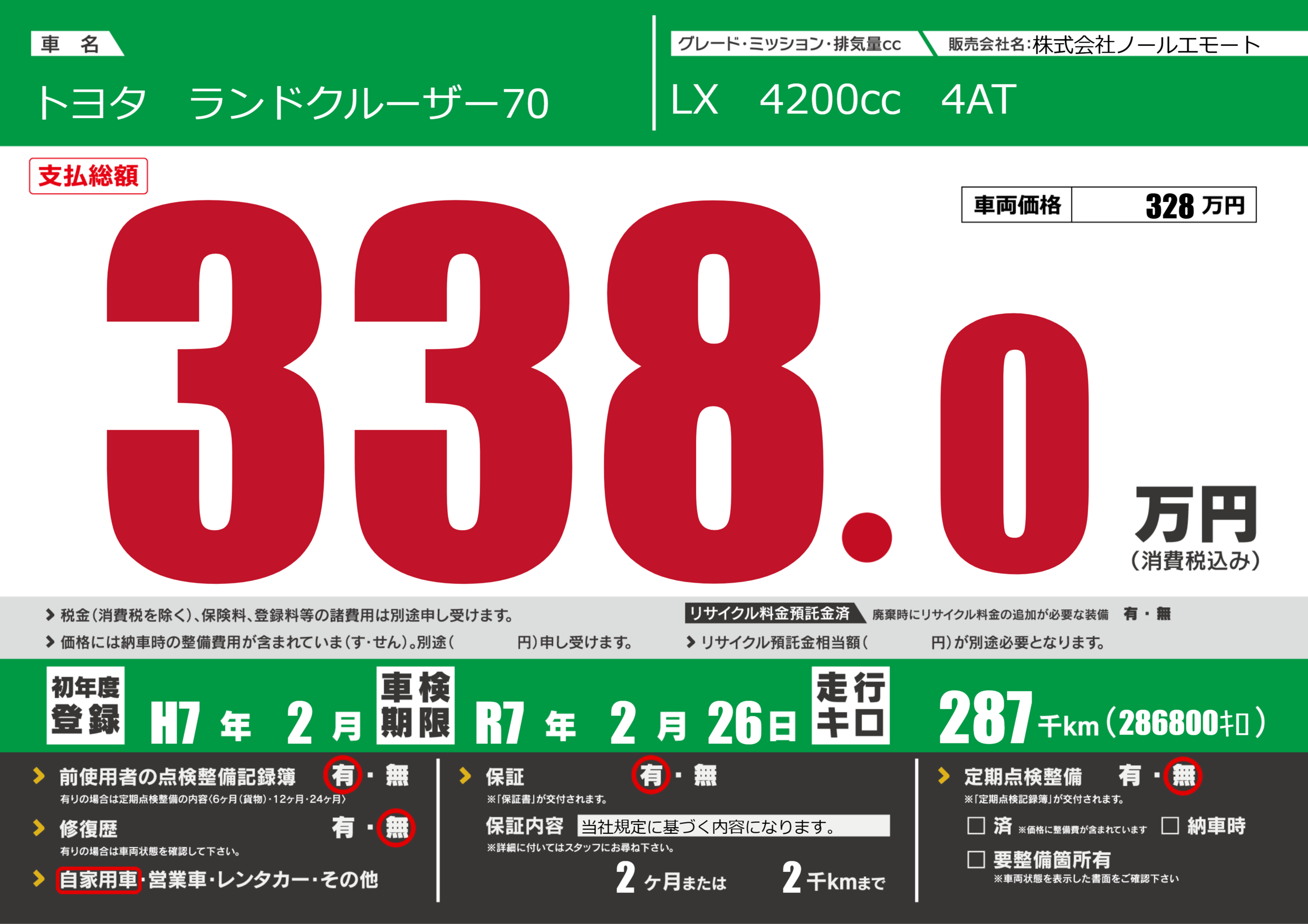 | 車名 | トヨタ ランドクルーザー70 | グレード ミッション 排気量 |