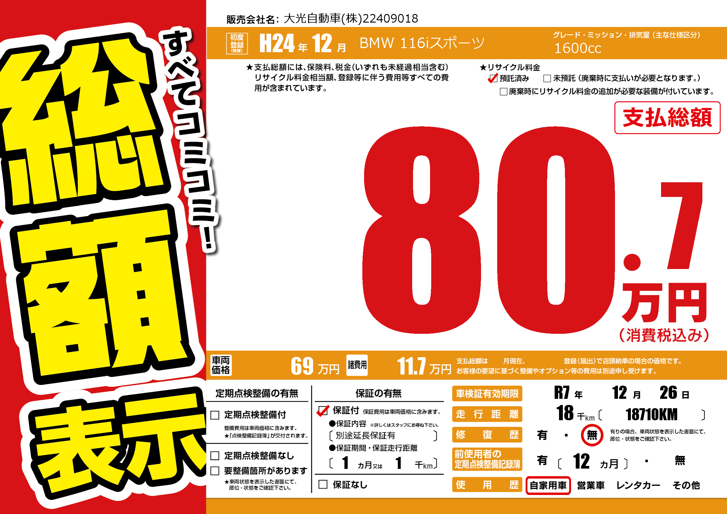 | 車名 | BMW 116iスポーツ | グレード ミッション 排気量 |