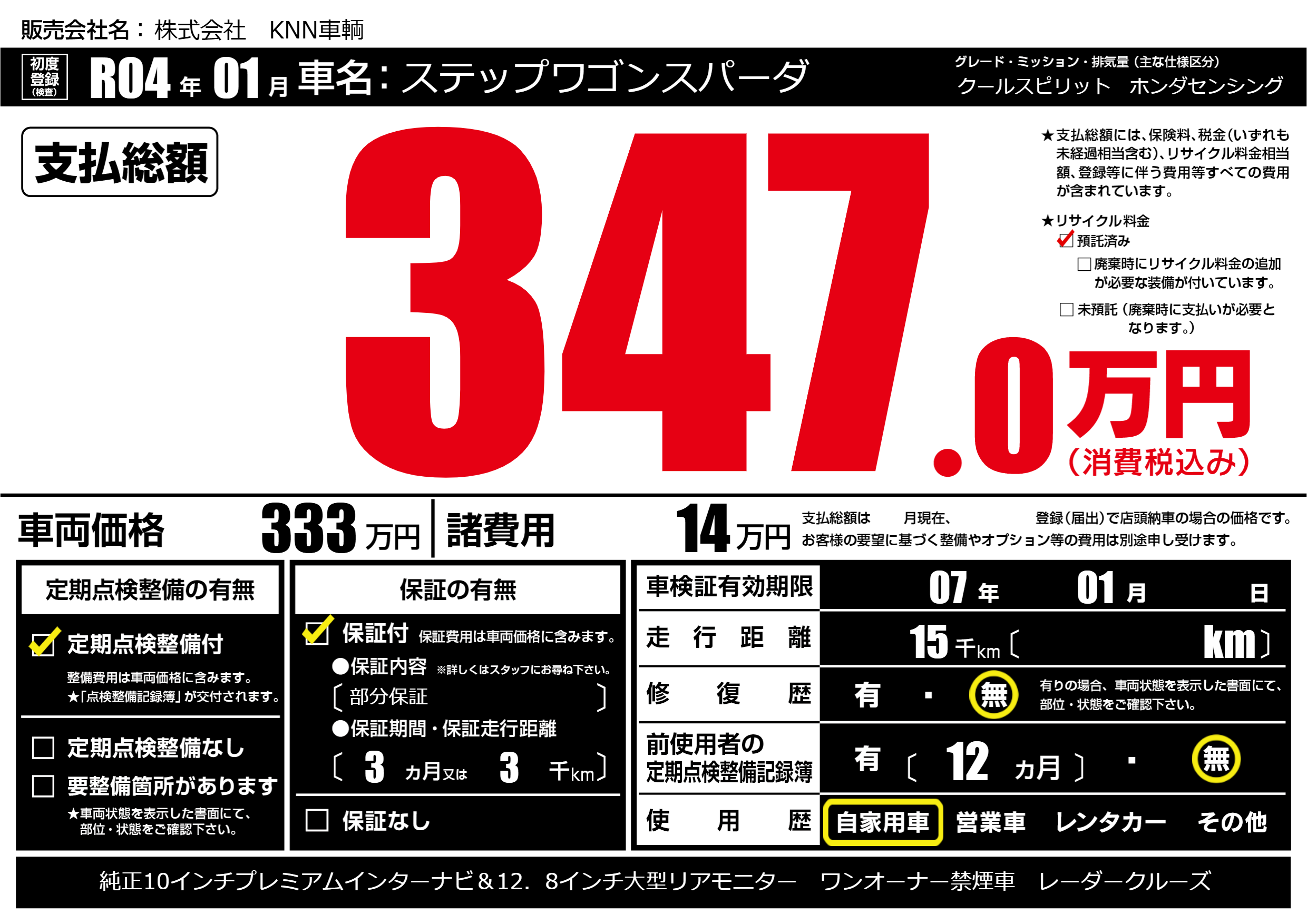 | 車名 | ステップワゴンスパーダ | グレード ミッション 排気量 |