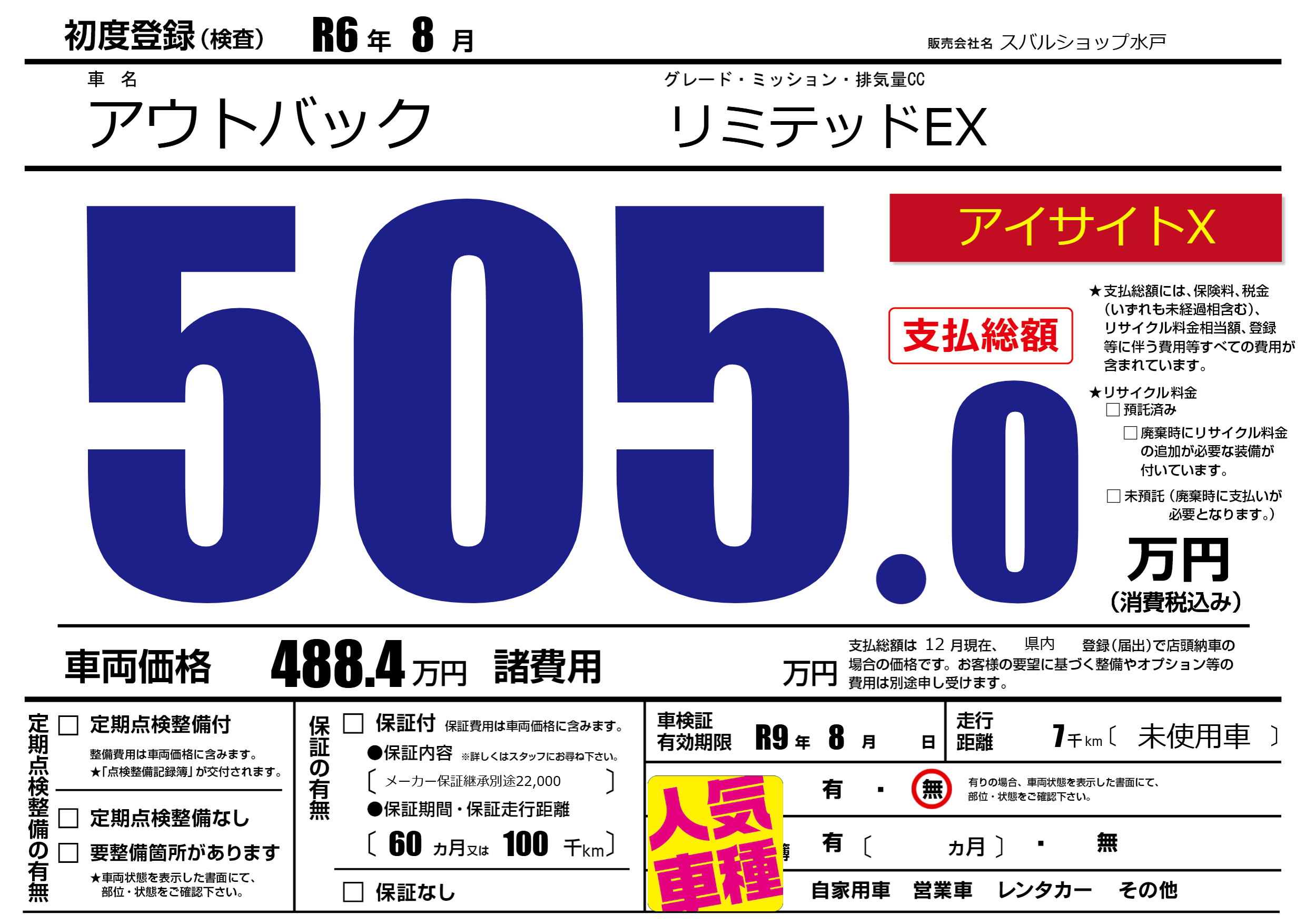 | 車名 | アウトバック | グレード ミッション 排気量 |