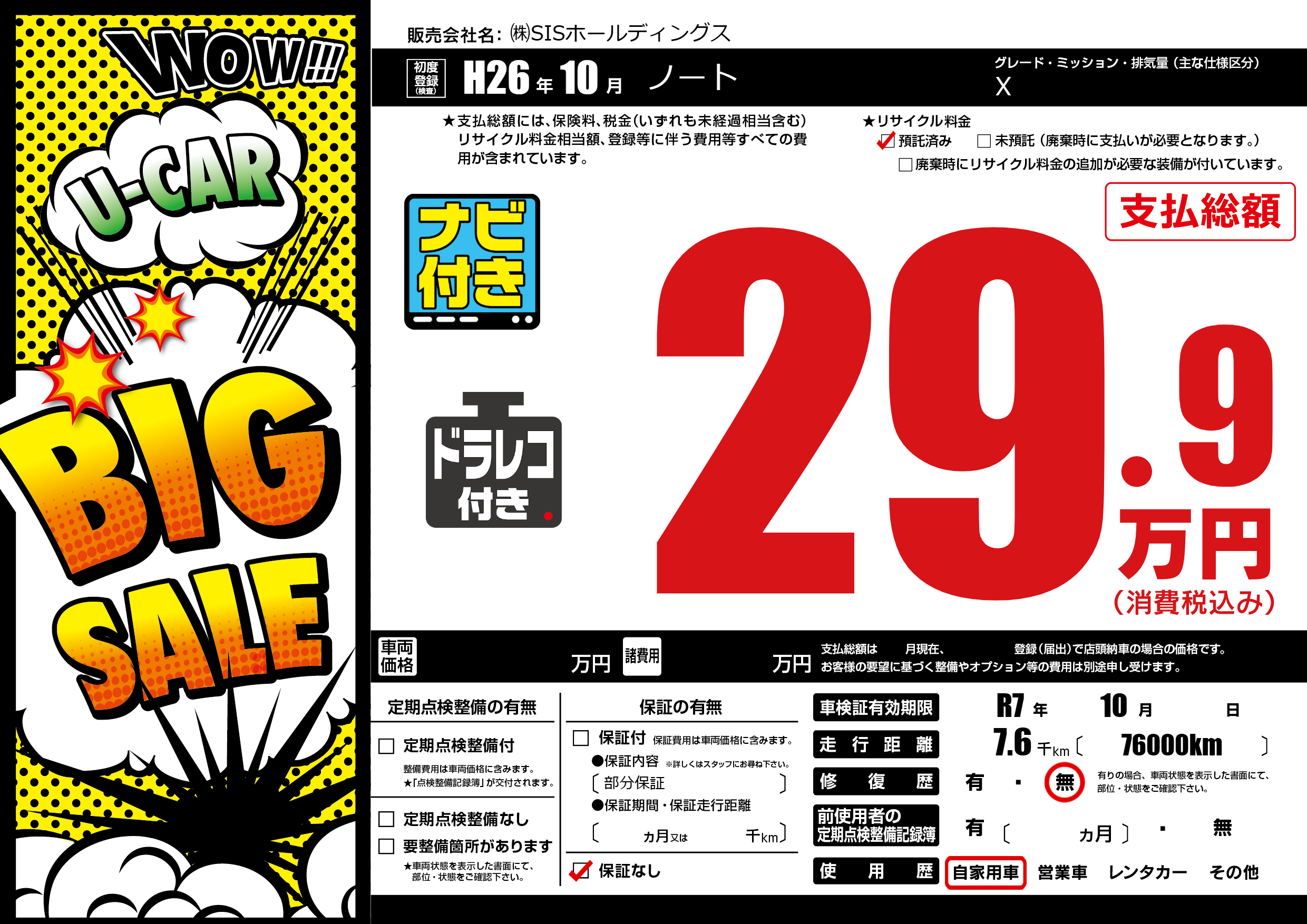 | 走行キロ | 0.7万km | 初年度登録 | H26年10月 |