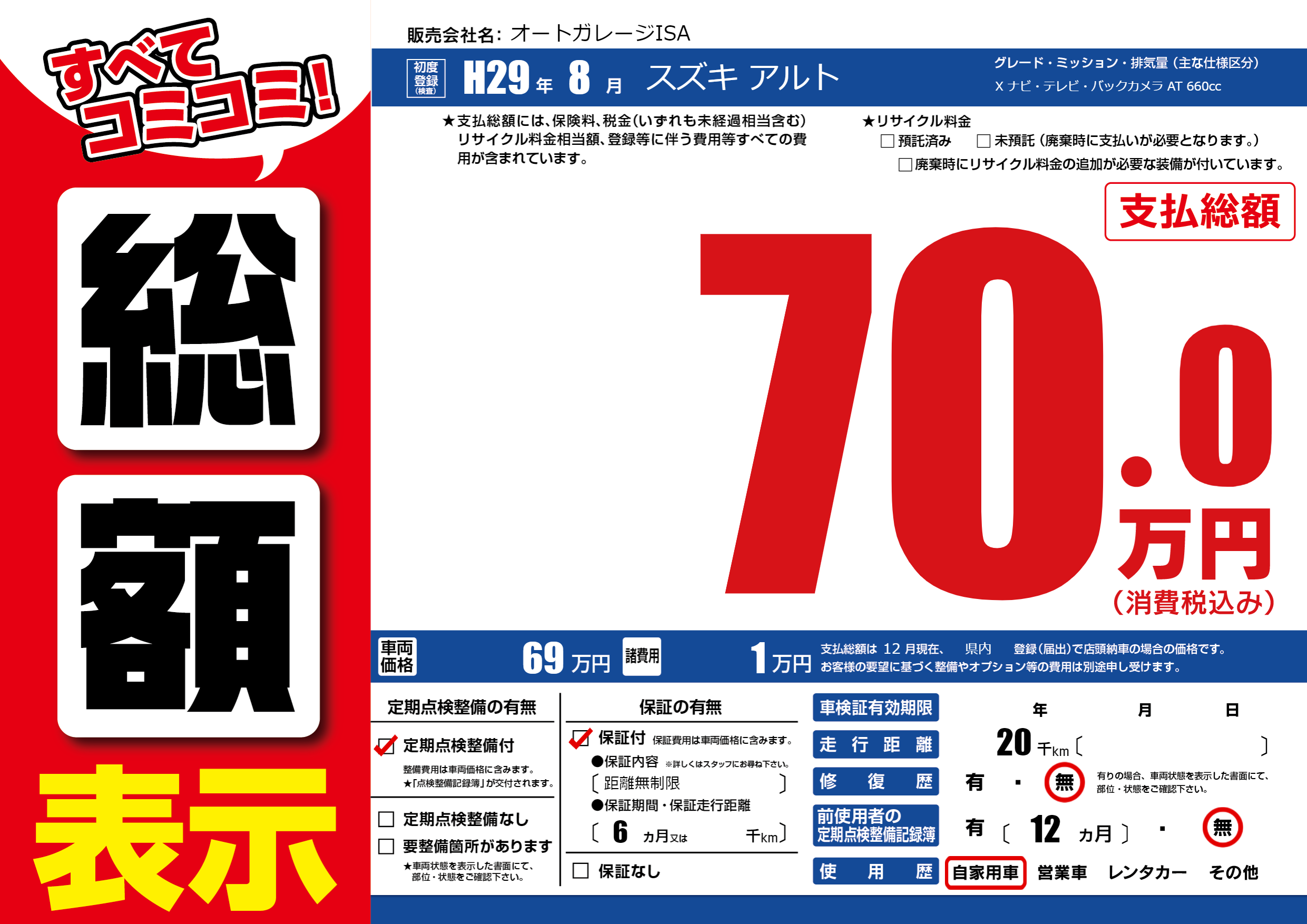 | 車名 | スズキ アルト | グレード ミッション 排気量 |