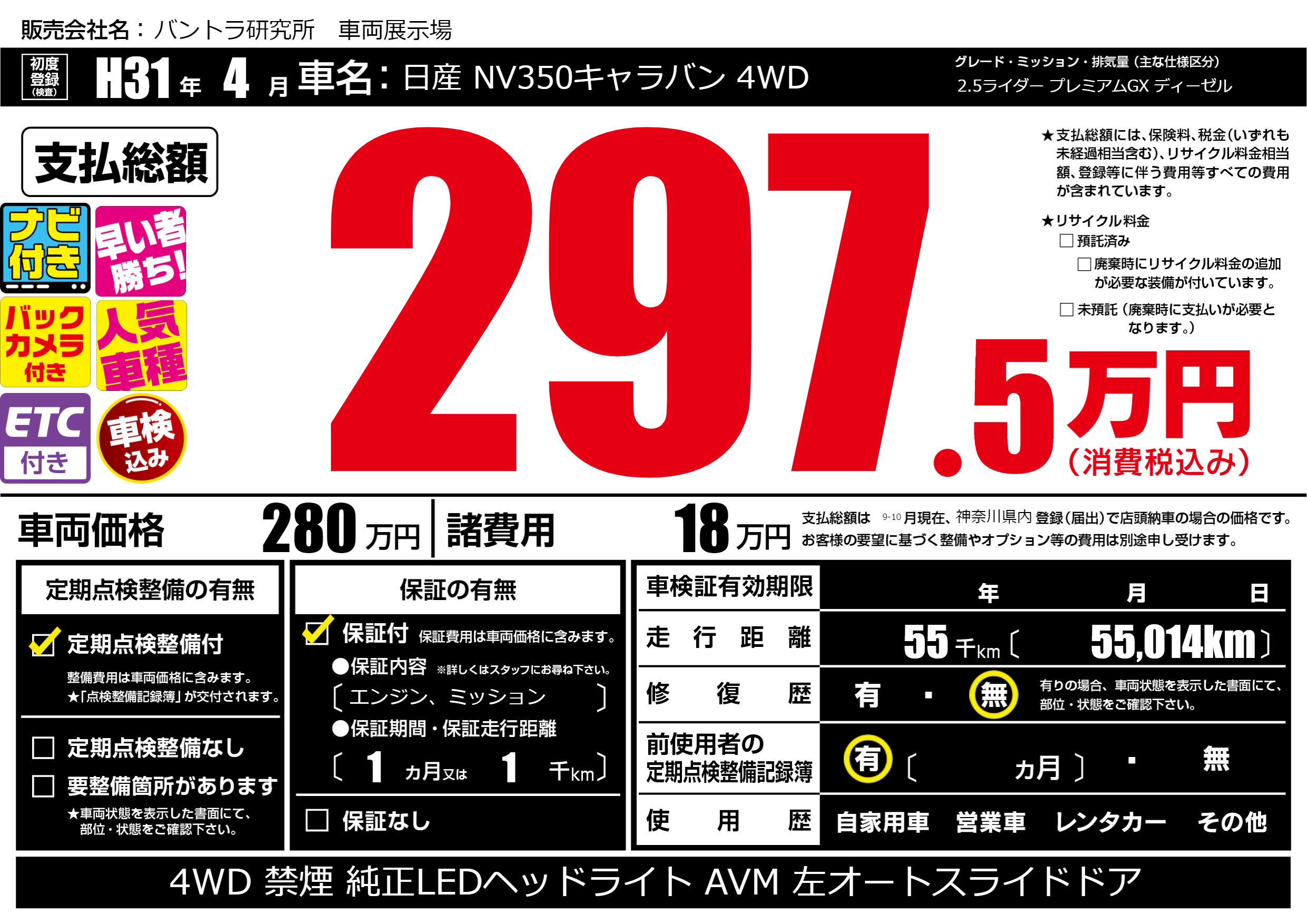 | 車名 | 日産 NV350キャラバン 4WD | グレード ミッション 排気量 |