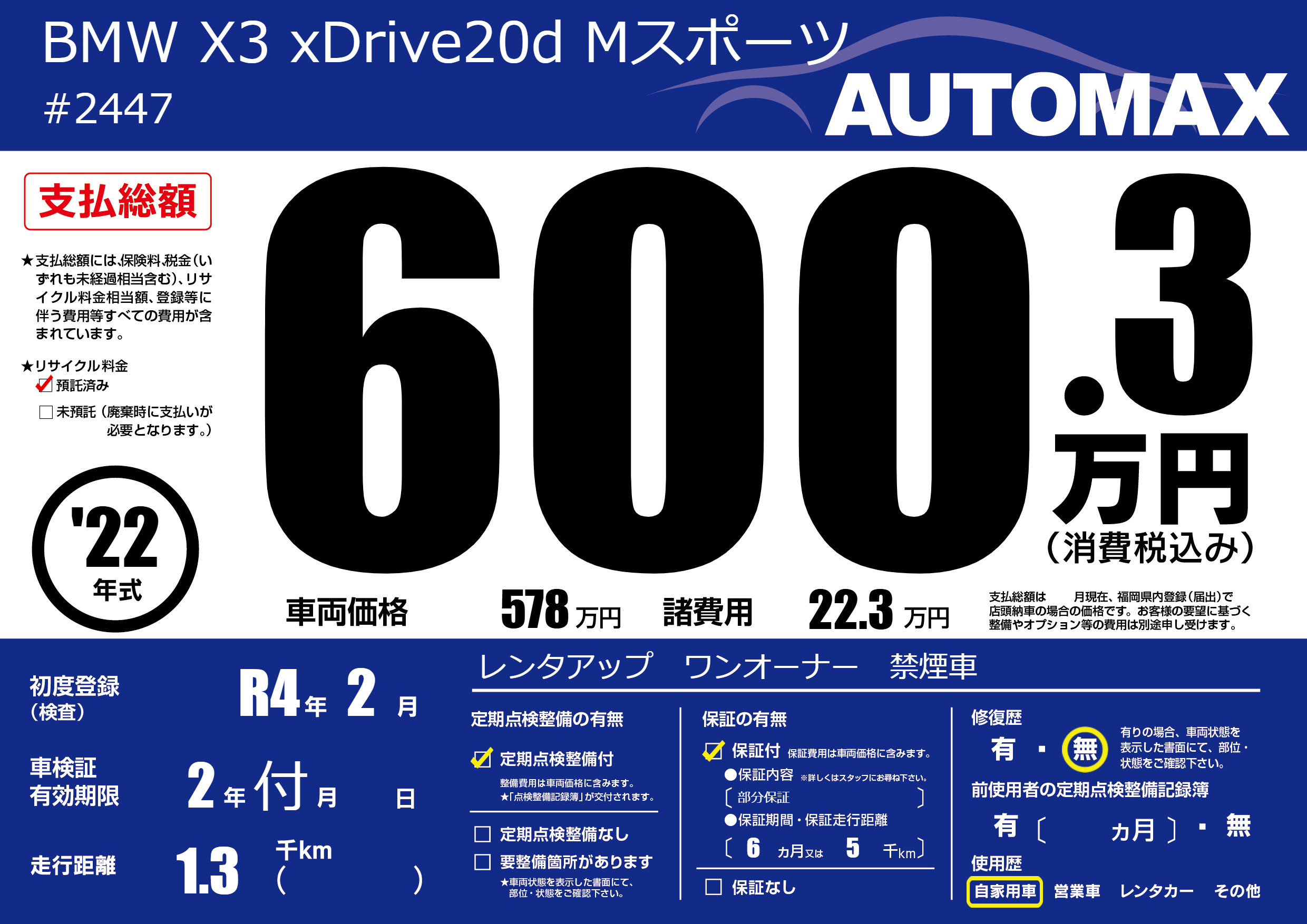 | 車名 | BMW X3 xDrive20d Mスポーツ | グレード ミッション 排気量 |