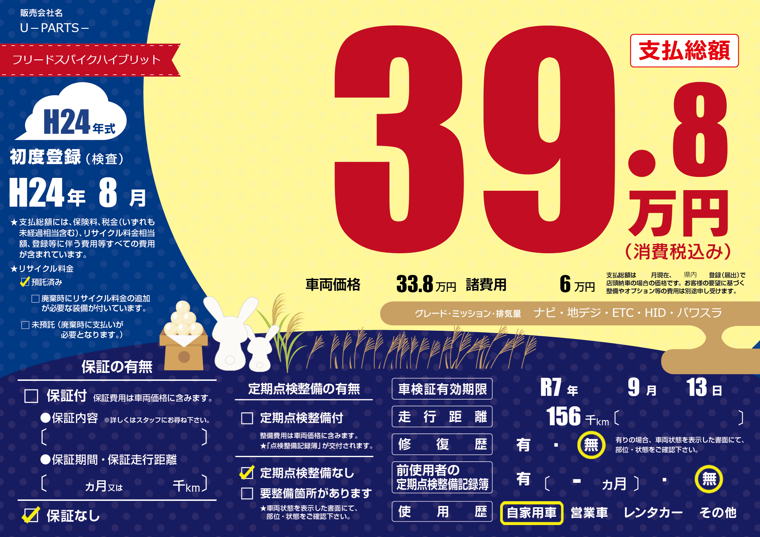 | 車名 | フリードスパイクハイブリット | グレード ミッション 排気量 |
