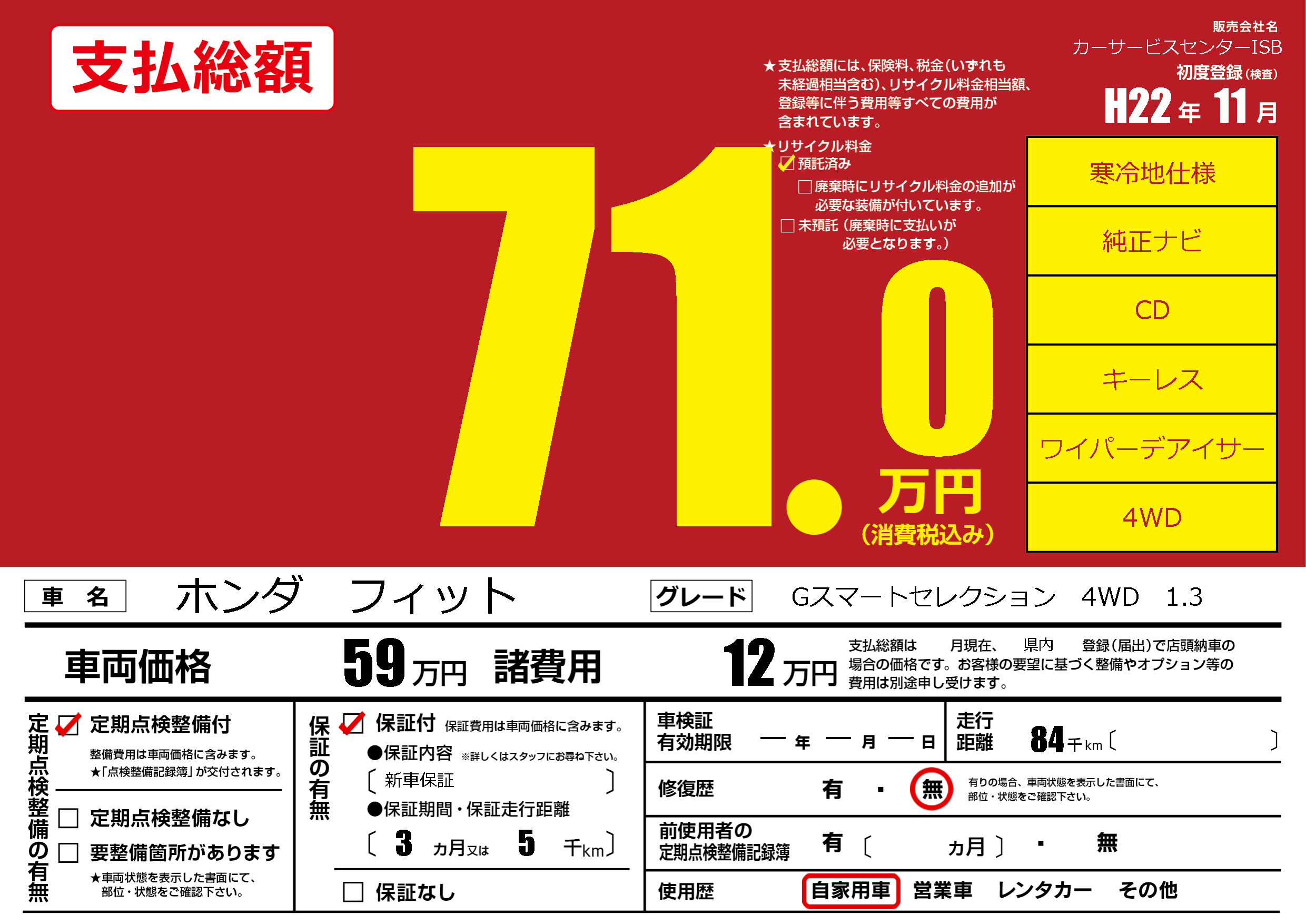 | 走行キロ | 8.4万km | 初年度登録 | H22年11月 |