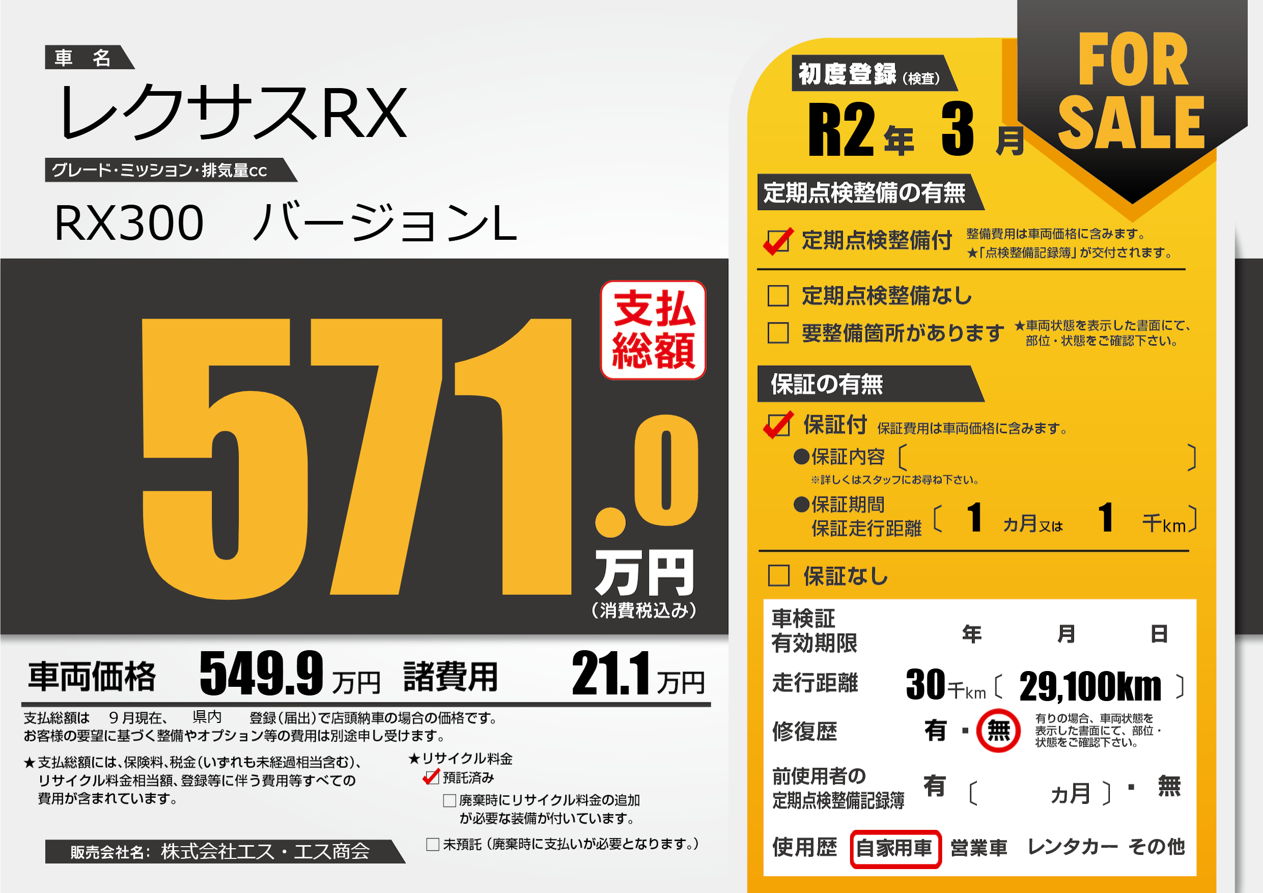 | 車名 | レクサスRX | グレード ミッション 排気量 |