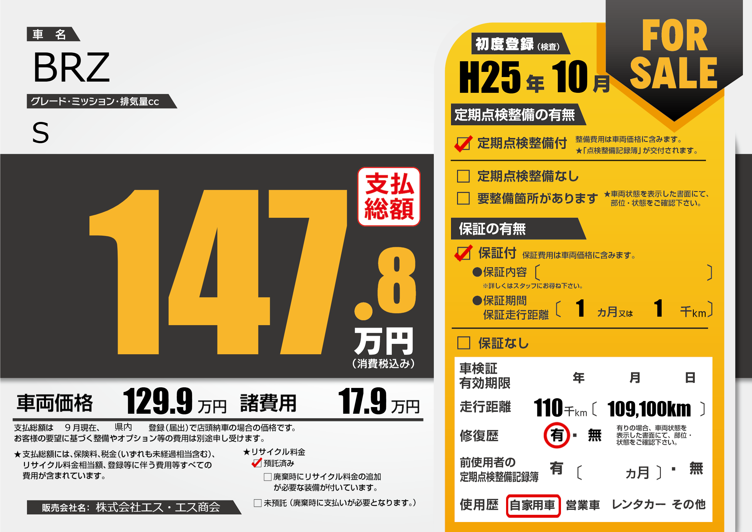 | 車名 | BRZ | グレード ミッション 排気量 |