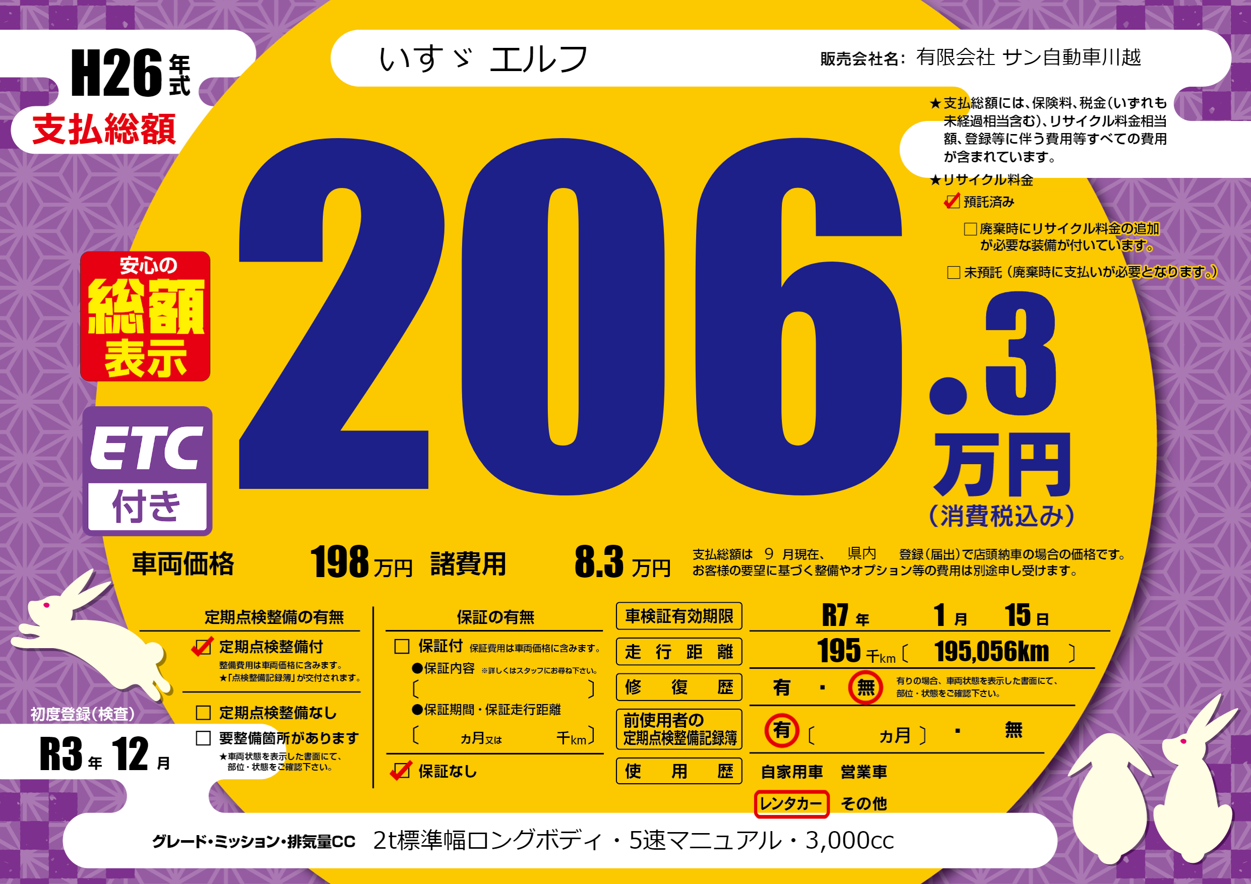 | 車名 | いすゞ エルフ | グレード ミッション 排気量 |