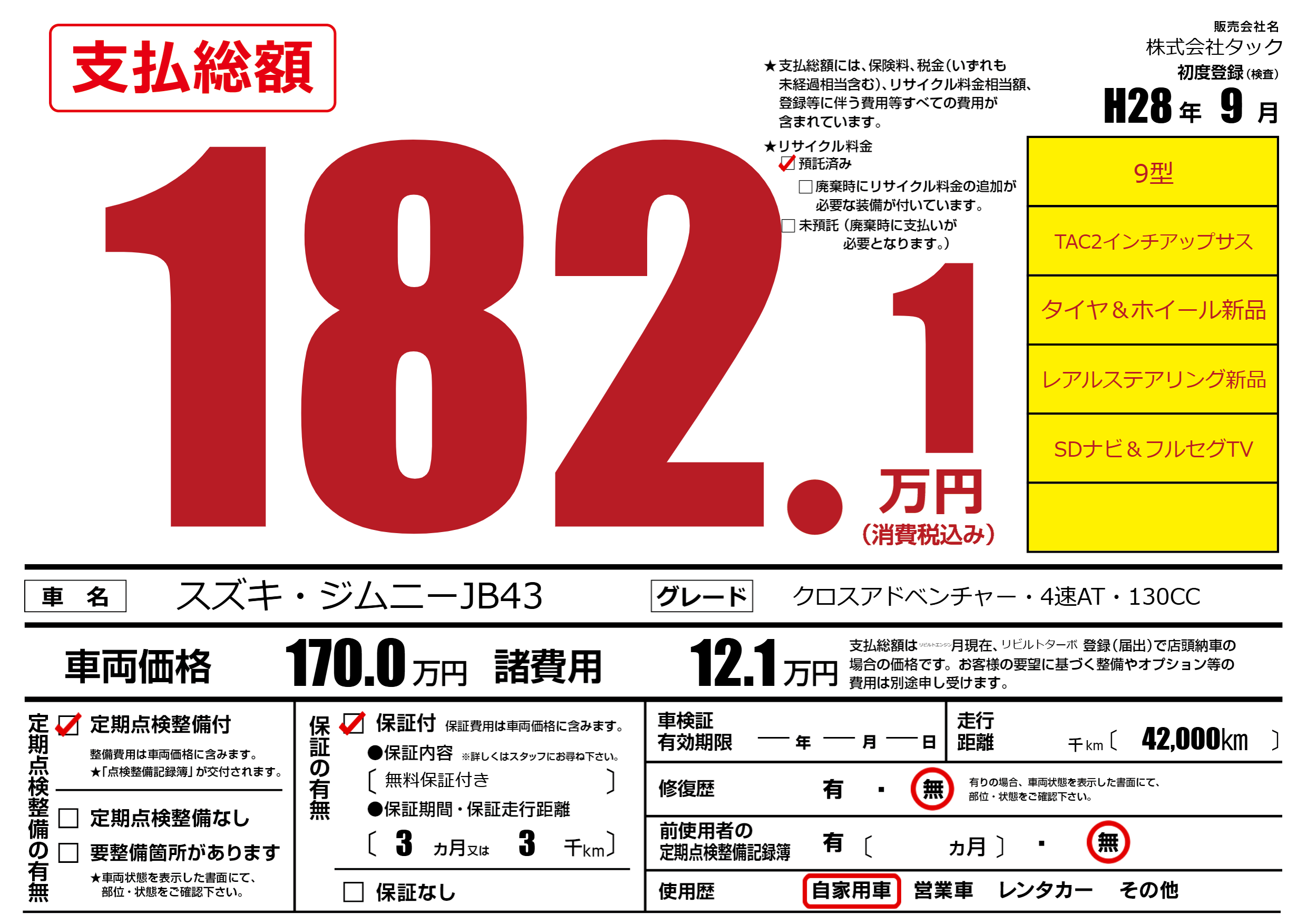 | 車名 | スズキ・ジムニーJB43 | グレード ミッション 排気量 |