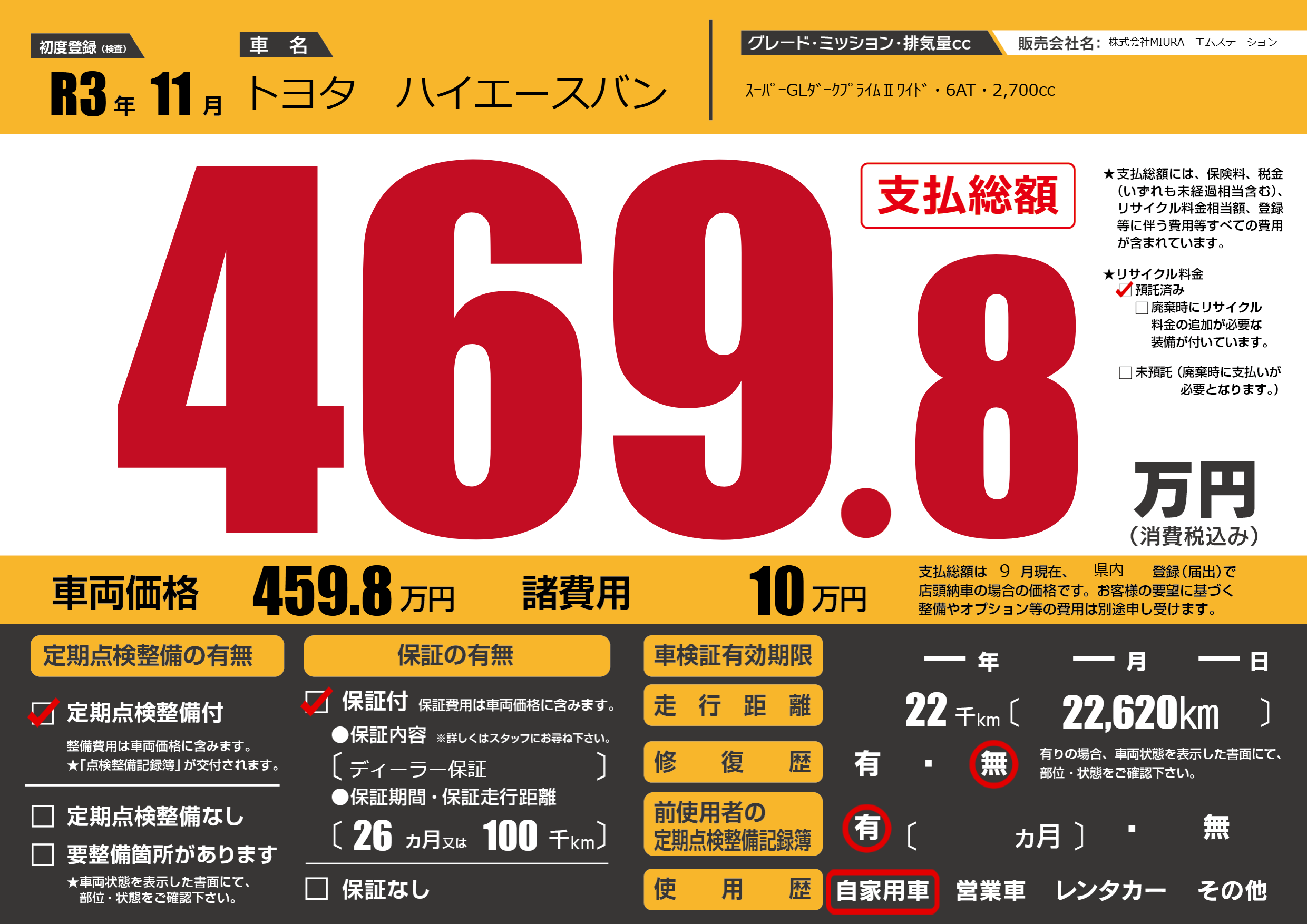 | 走行キロ | 2.2万km | 初年度登録 | R3年11月 |