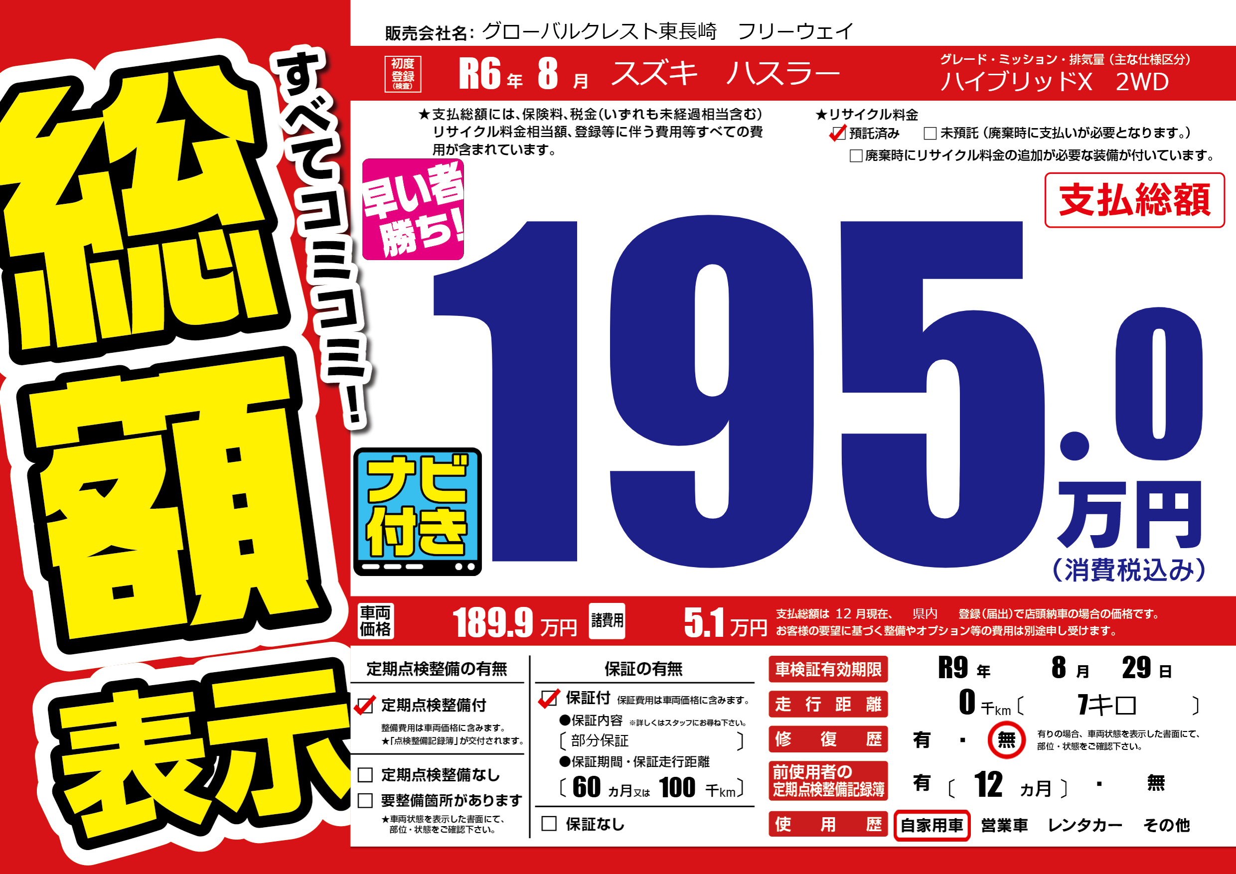 | 車名 | スズキ ハスラー | グレード ミッション 排気量 |