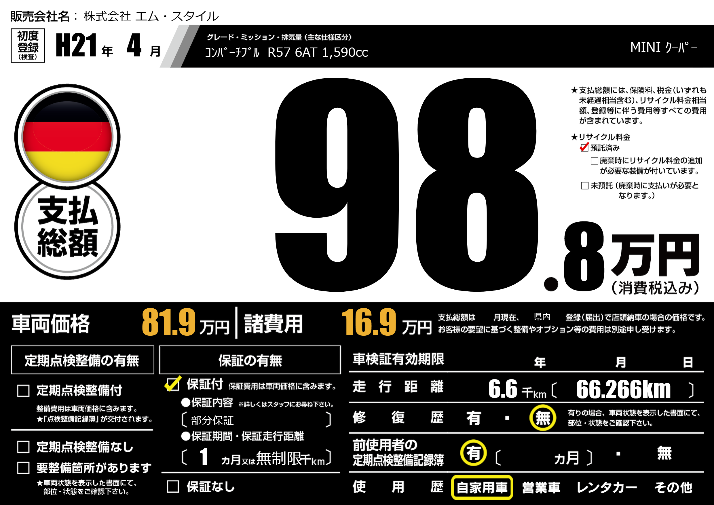 | 車名 | MINI クーパー | グレード ミッション 排気量 |