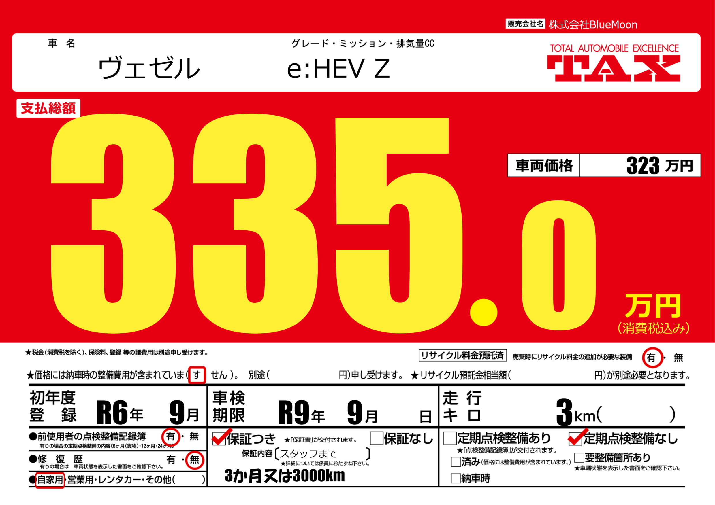 あり | 車検制限 | R9年9月---月 |
