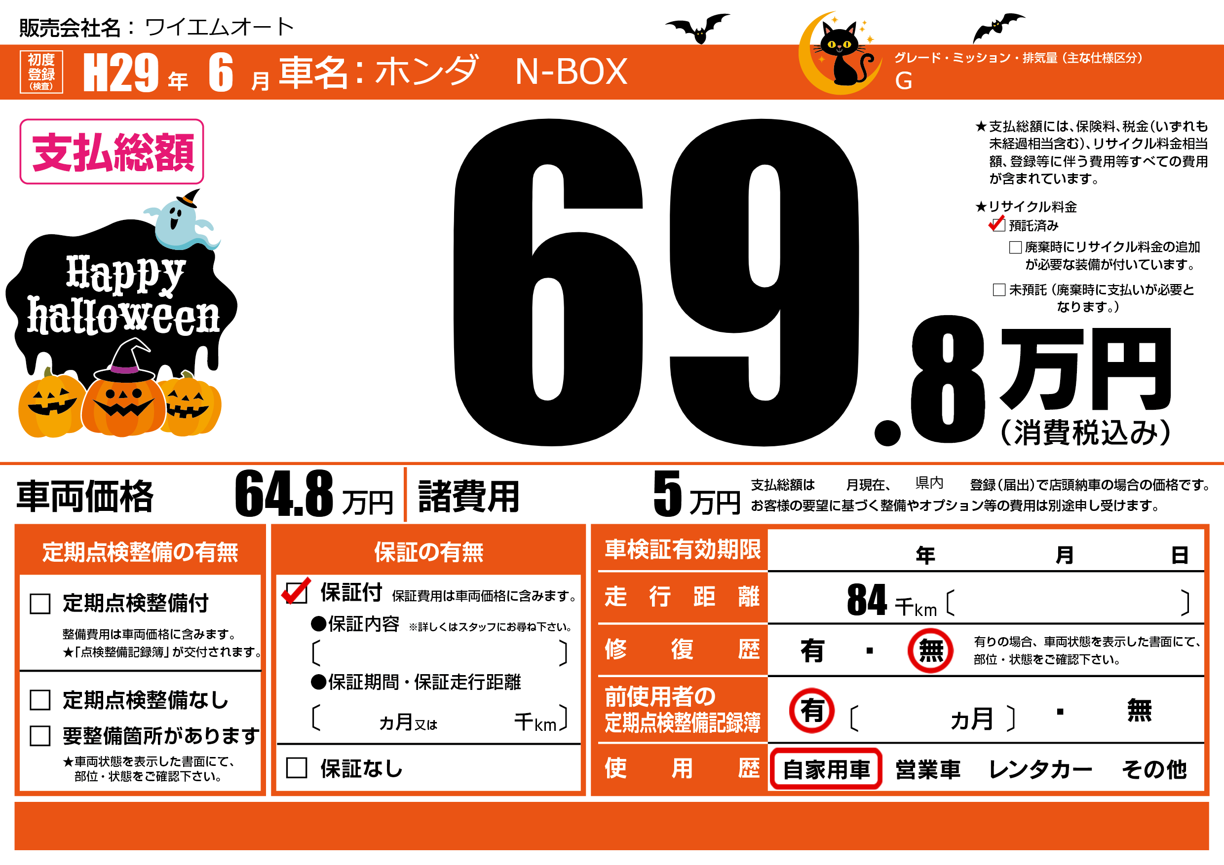 | 車名 | ホンダ N-BOX | グレード ミッション 排気量 |