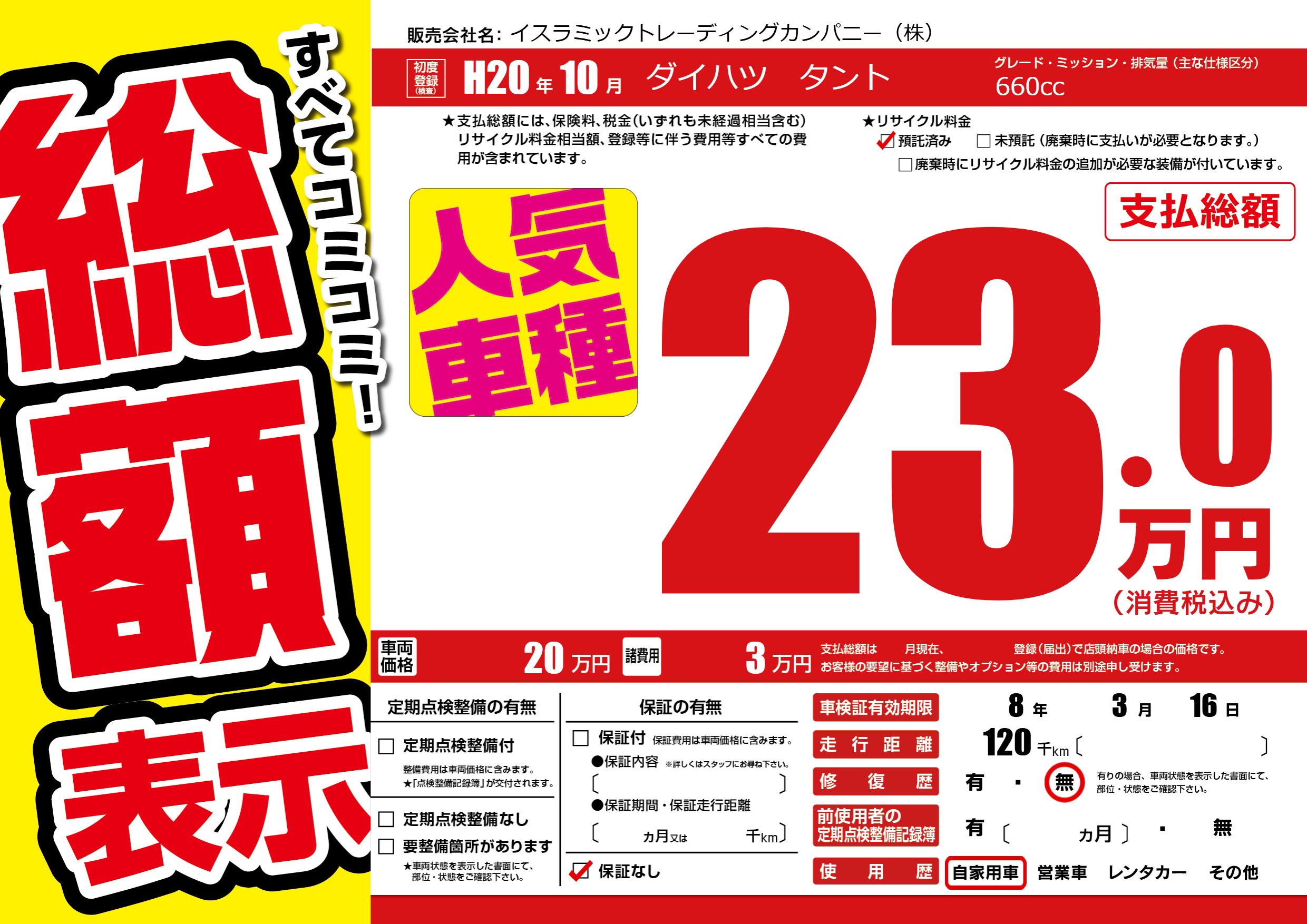 | 走行キロ | 12万km | 初年度登録 | H20年10月 |