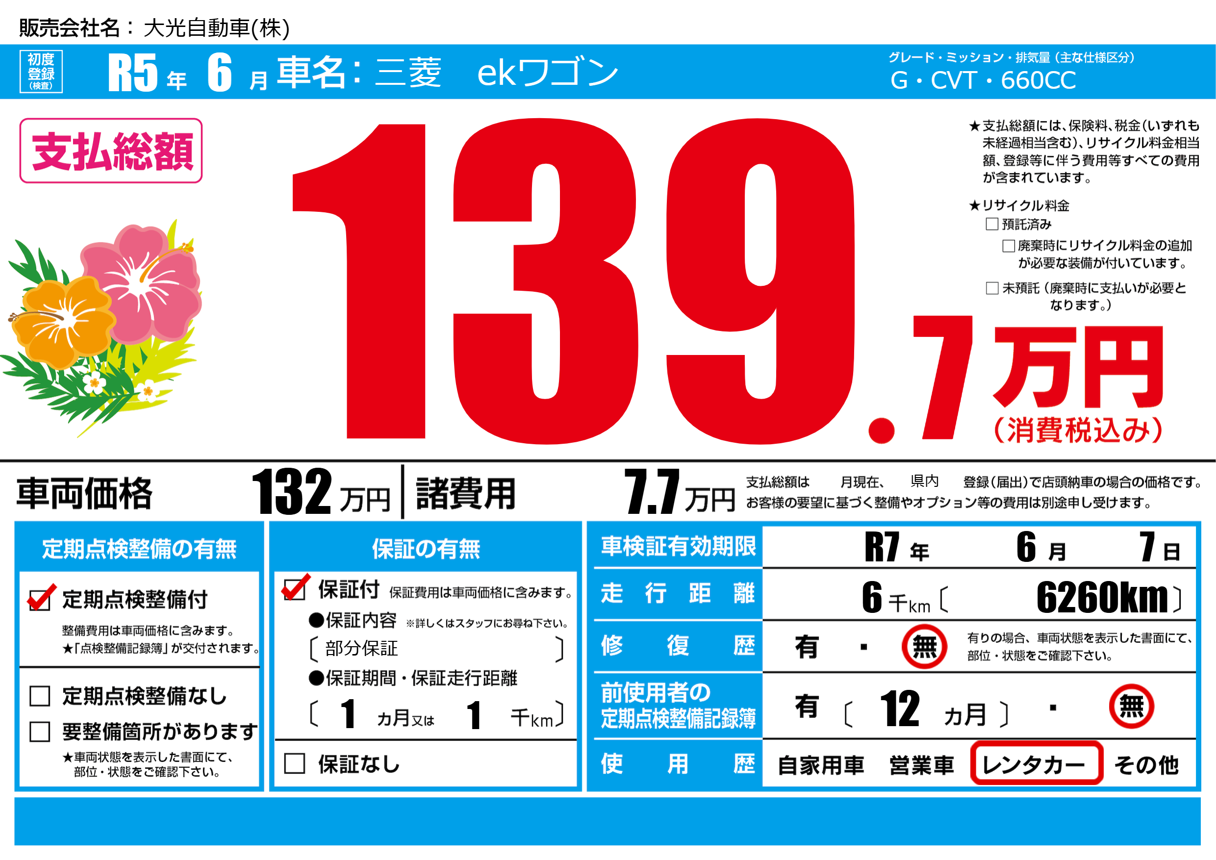 | 走行キロ | 0.6万km | 初年度登録 | R5年6月 |