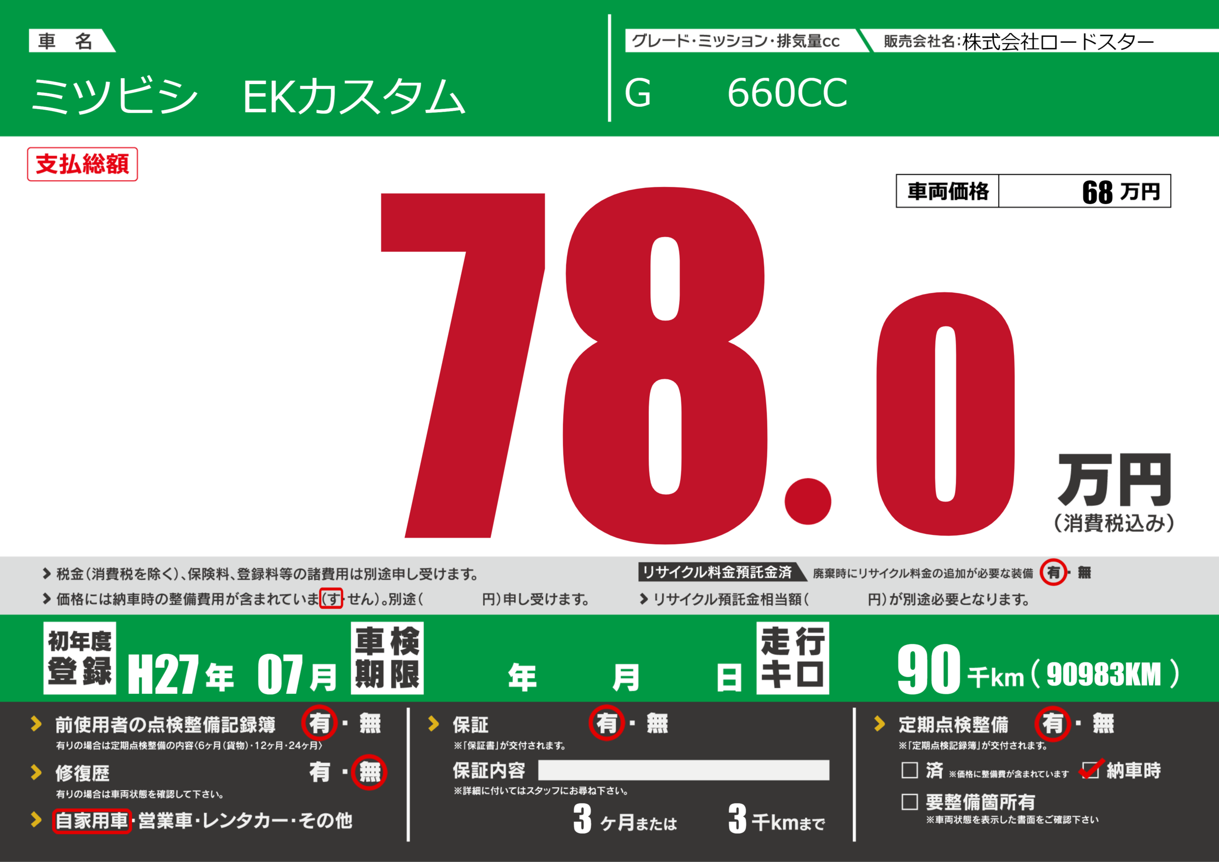 保証付き 保証内容(---) 3ヶ月または(3)千kmまで |
