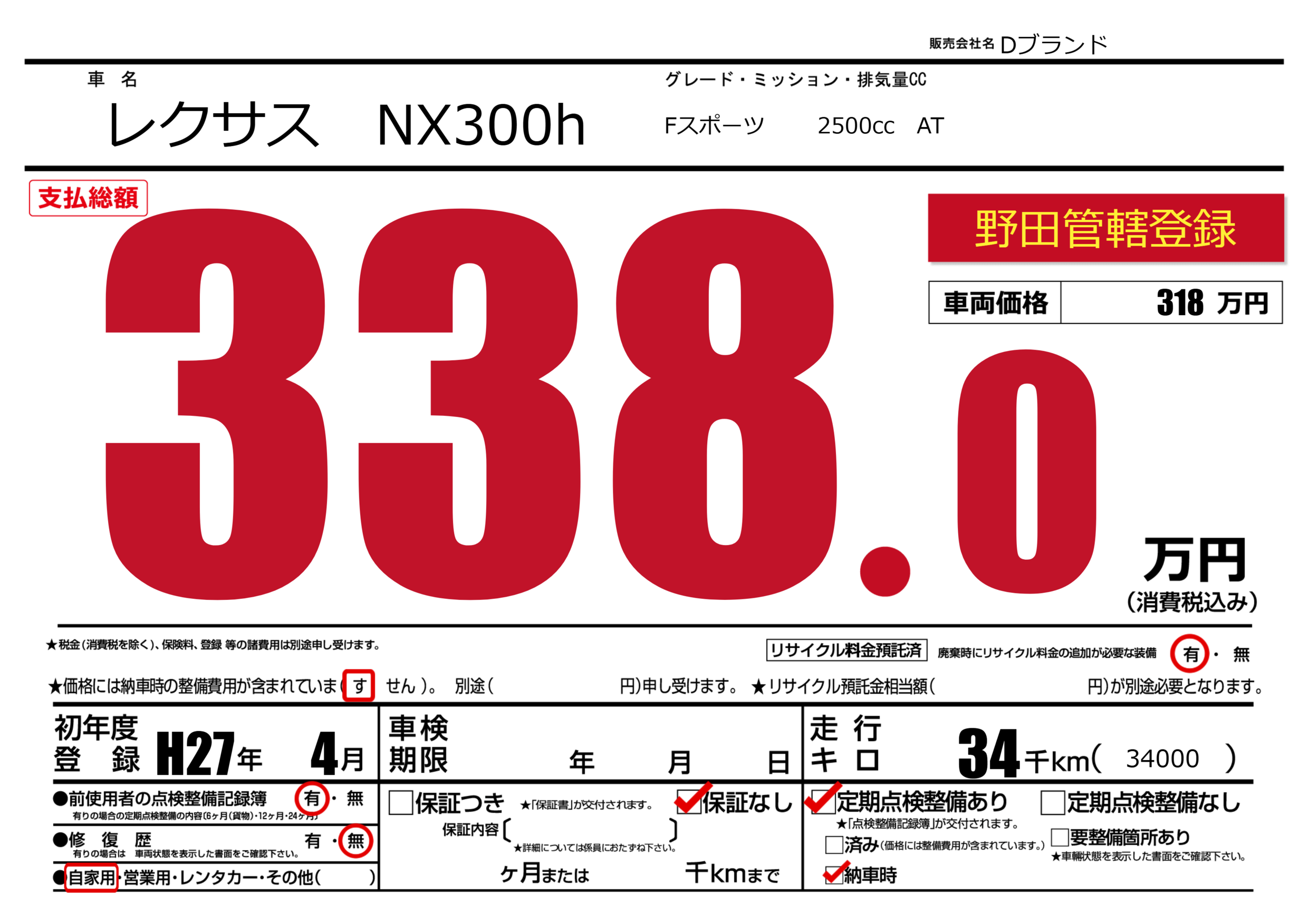 | 車名 | レクサス NX300h | グレード ミッション 排気量 |