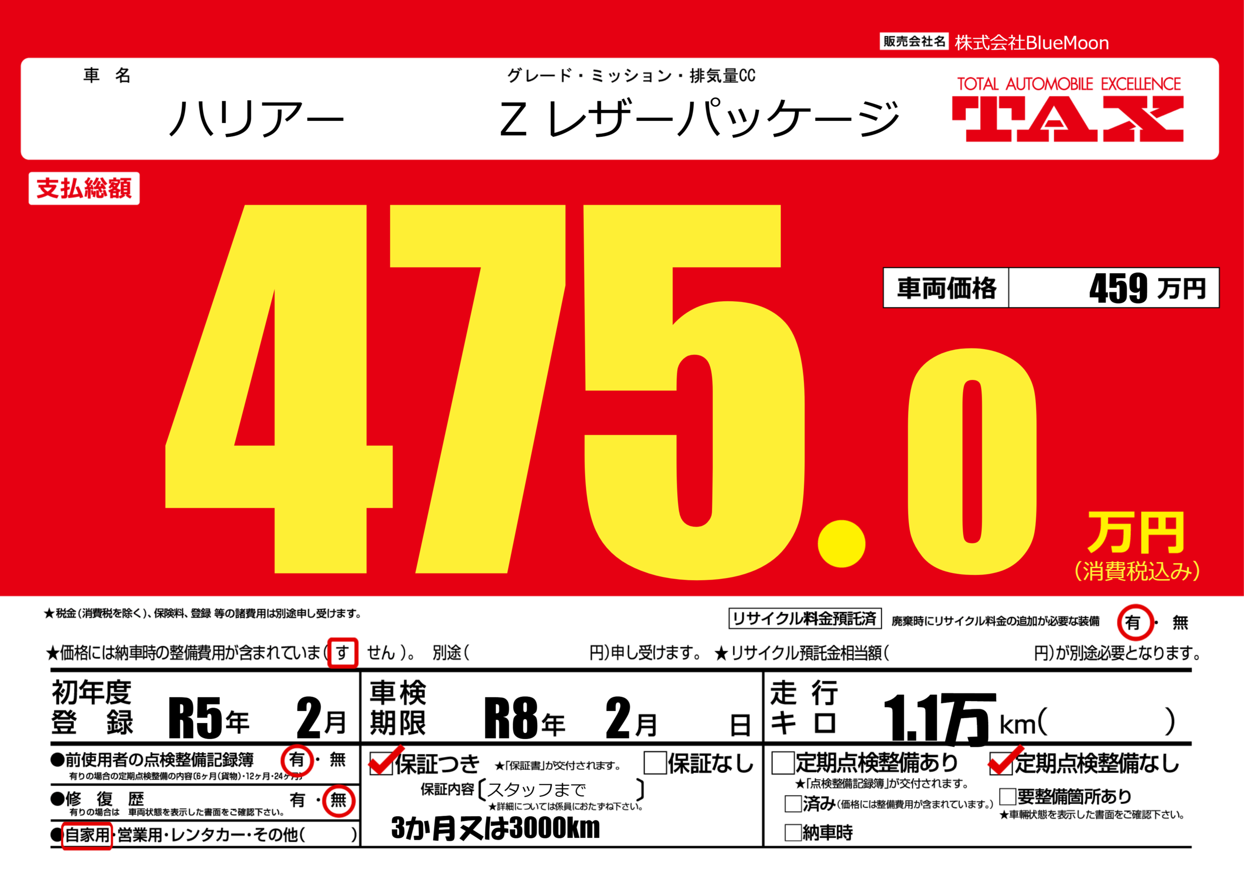 保証付き 保証内容(スタッフまで) ---ヶ月または()千kmまで |