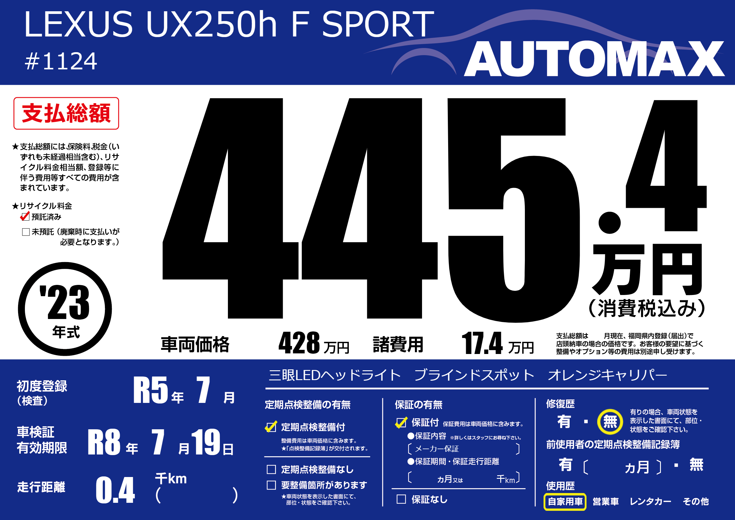 | 車名 | LEXUS UX250h F SPORT | グレード ミッション 排気量 |