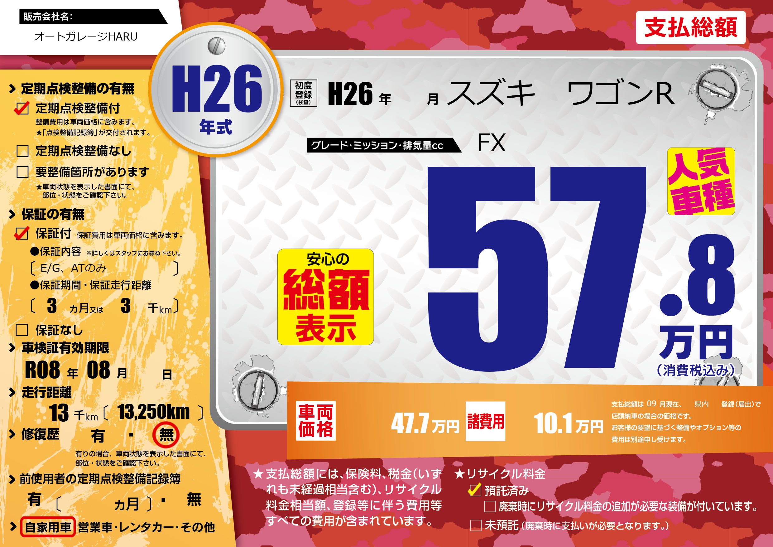 | 車検制限 | R08年 08月 - 日 | ||