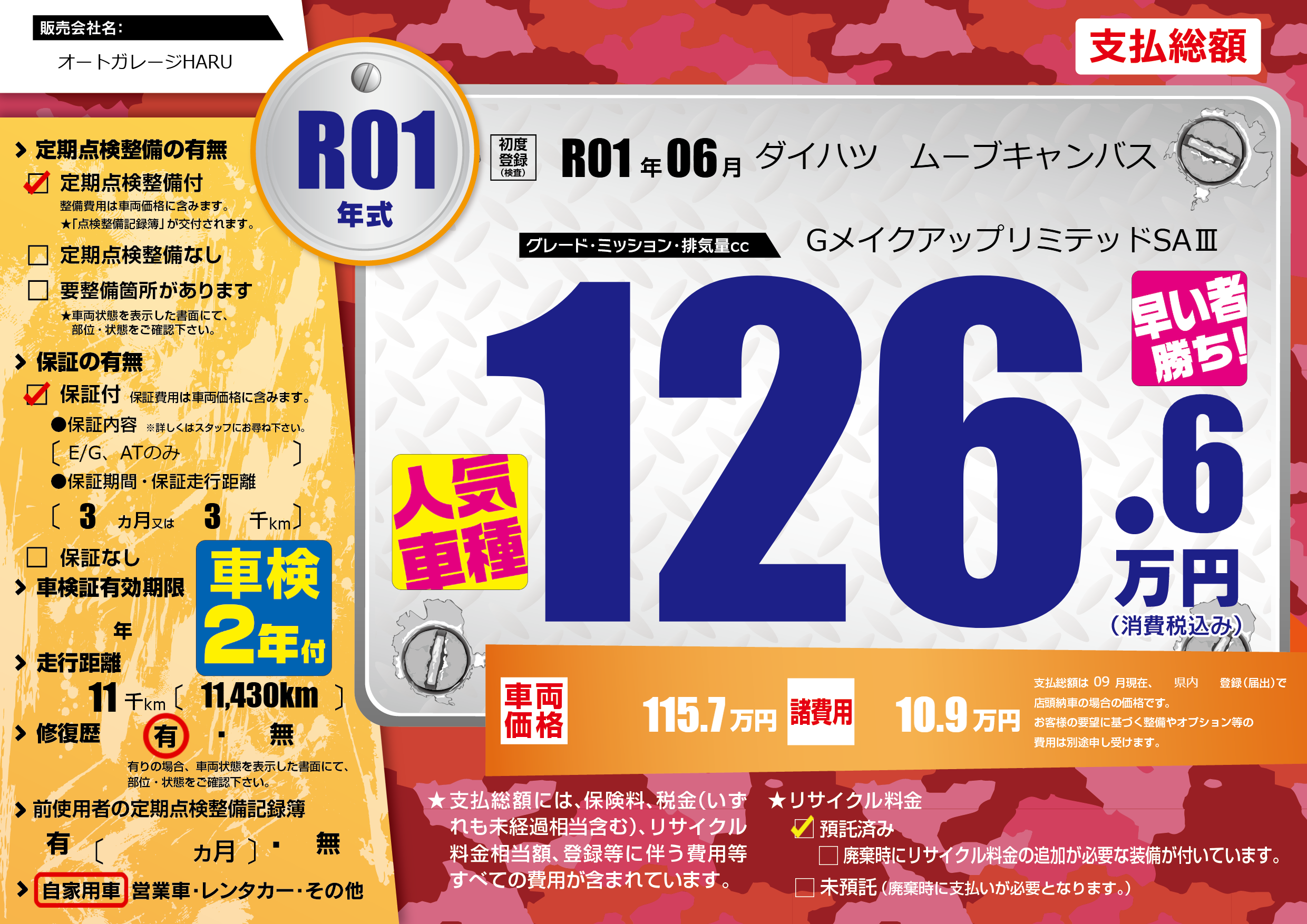 | 走行キロ | 1.1万km | 初年度登録 | R01年06月 |