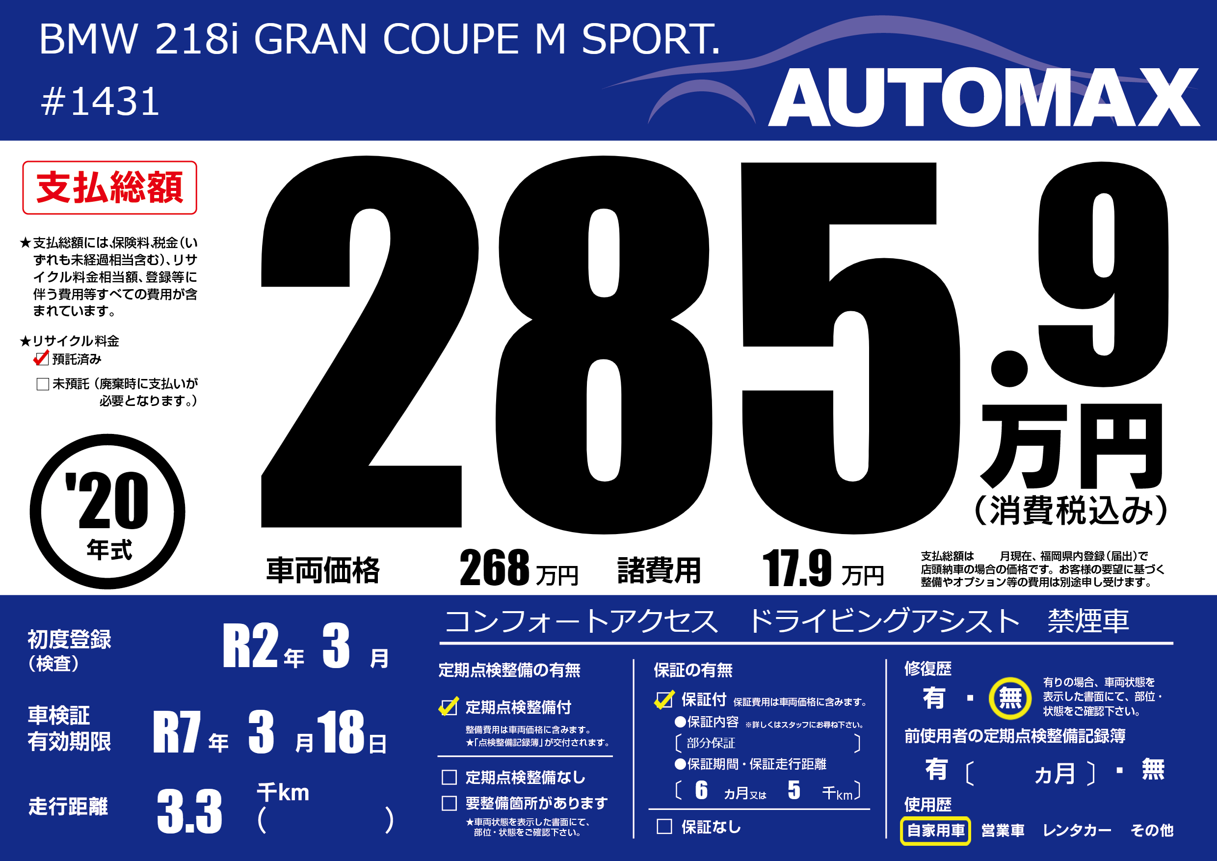 | 車名 | BMW 218i GRAN COUPE M SPORT. | グレード ミッション 排気量 |